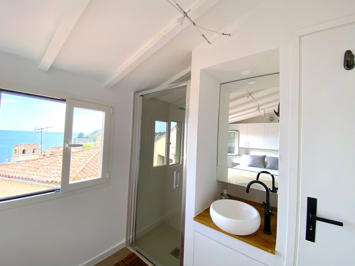 Fully renovated, equipped and air-conditioned, it offers a magnificent sea view. It is composed as follows: The living room is equipped with a quality sofa bed, a coffee table, a bar and its 4 stools, a table, a low cabinet with Tv and a WiFi internet connection.