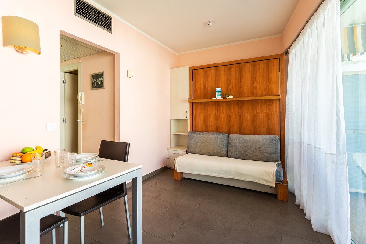 - A living room / dining area with a double sofa bed