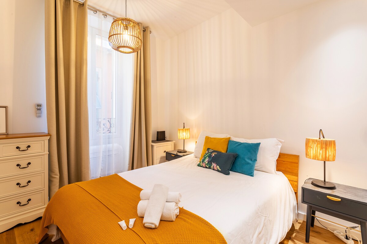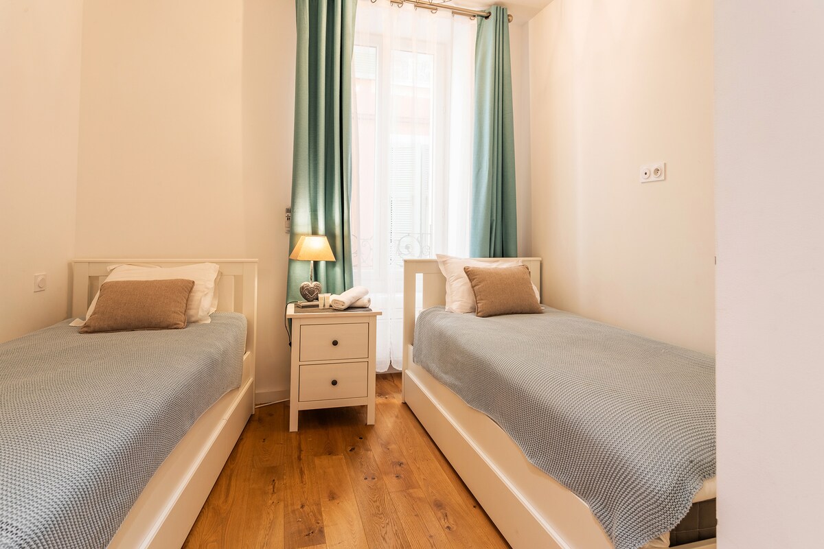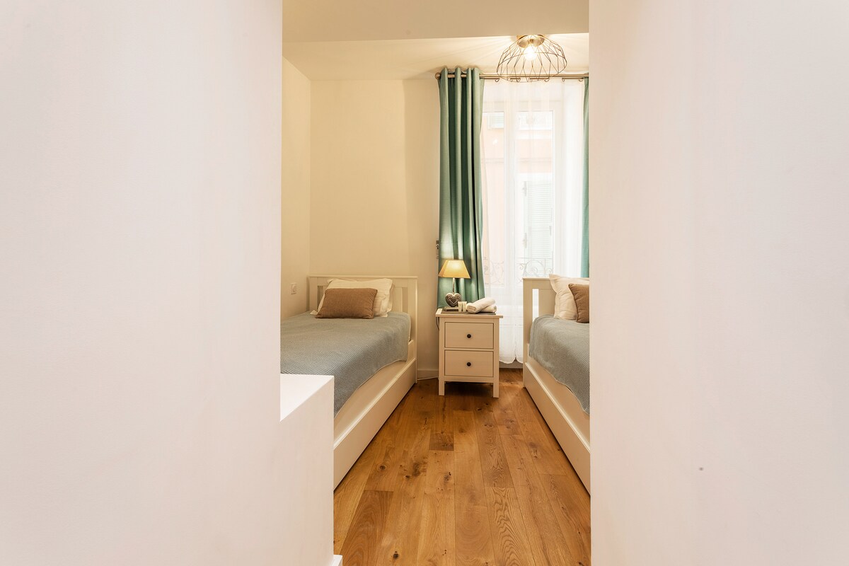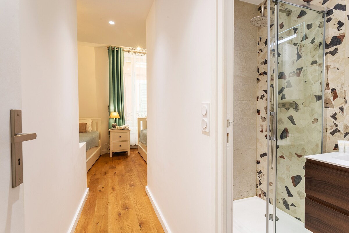 The first bedroom is air-conditioned, with a double bed, bedside tables, as well as a wardrobe and a chest of drawers. It has its own private bathroom with shower and washbasin as well as a Wc. Window overlooking a very quiet street in the old town. The second bedroom is also air-conditioned, with two single beds, a wardrobe and bedside tables. Window overlooking a very quiet street in the old town. It also has its own bathroom with shower, washbasin and storage. An independent Wc. A laundry room with washing machine and storage. All household linen (sheets-towels) and toiletries are provided, as well as a vacuum cleaner, hair dryer and iron. Note that the stairs leading to the accommodation from the private entrance are not protected by a barrier, which could make the accommodation unsuitable for young children.