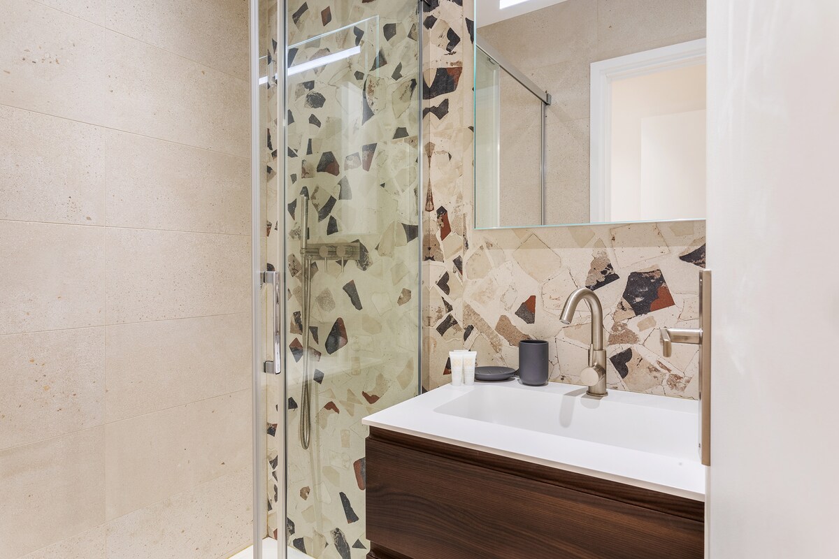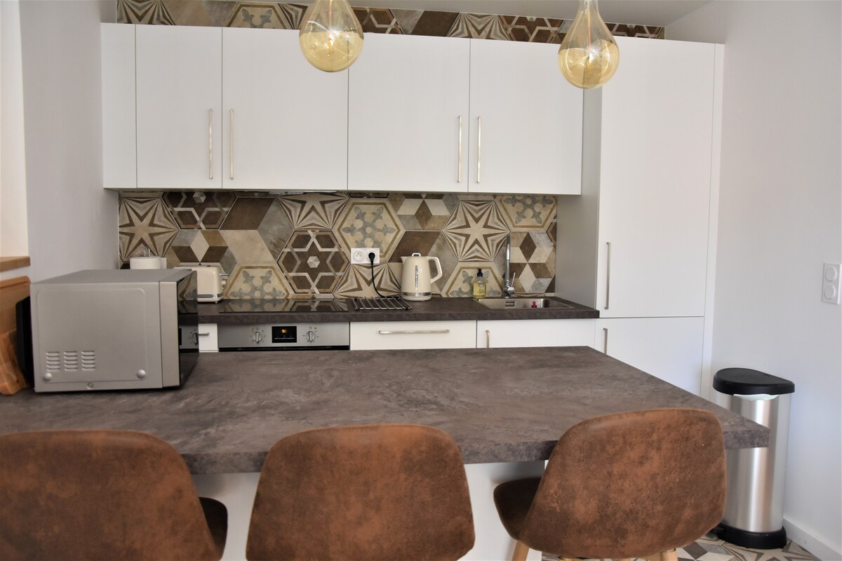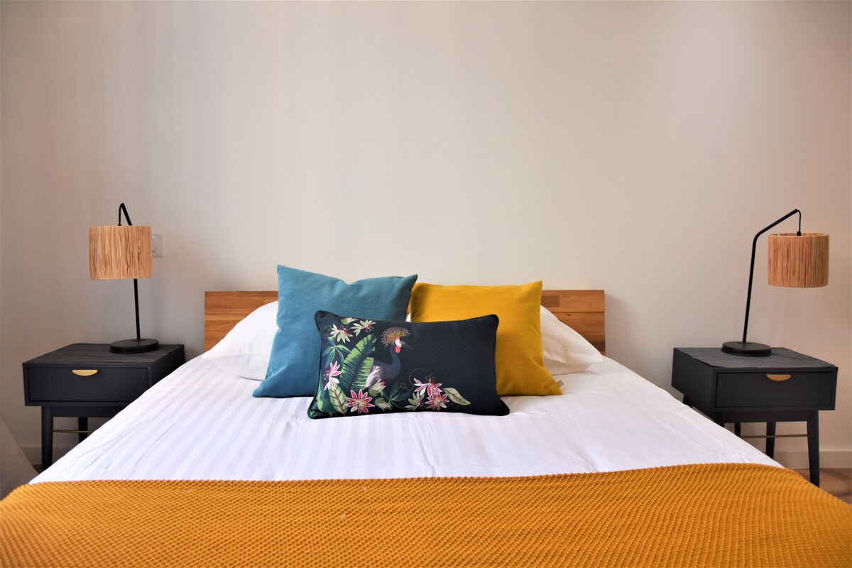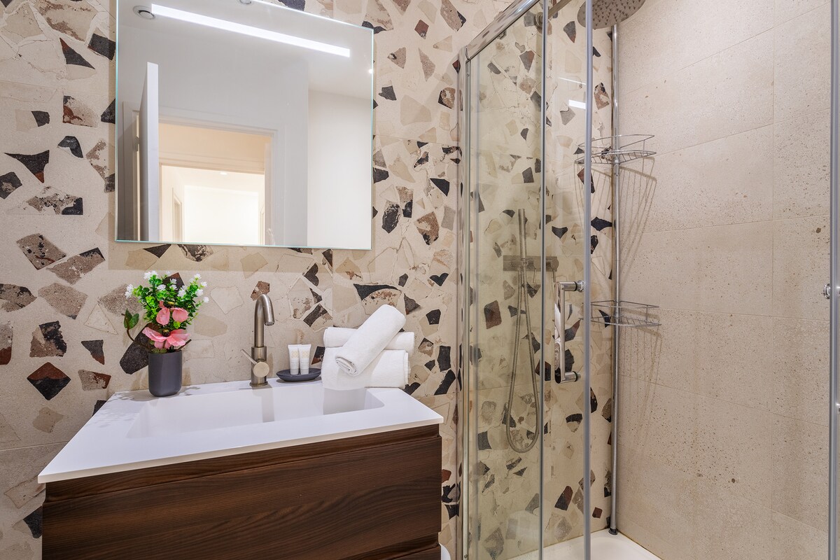 The first bedroom is air-conditioned, with a double bed, bedside tables, as well as a wardrobe and a chest of drawers. It has its own private bathroom with shower and washbasin as well as a Wc. Window overlooking a very quiet street in the old town. The second bedroom is also air-conditioned, with two single beds, a wardrobe and bedside tables. Window overlooking a very quiet street in the old town. It also has its own bathroom with shower, washbasin and storage. An independent Wc. A laundry room with washing machine and storage. All household linen (sheets-towels) and toiletries are provided, as well as a vacuum cleaner, hair dryer and iron. Note that the stairs leading to the accommodation from the private entrance are not protected by a barrier, which could make the accommodation unsuitable for young children.