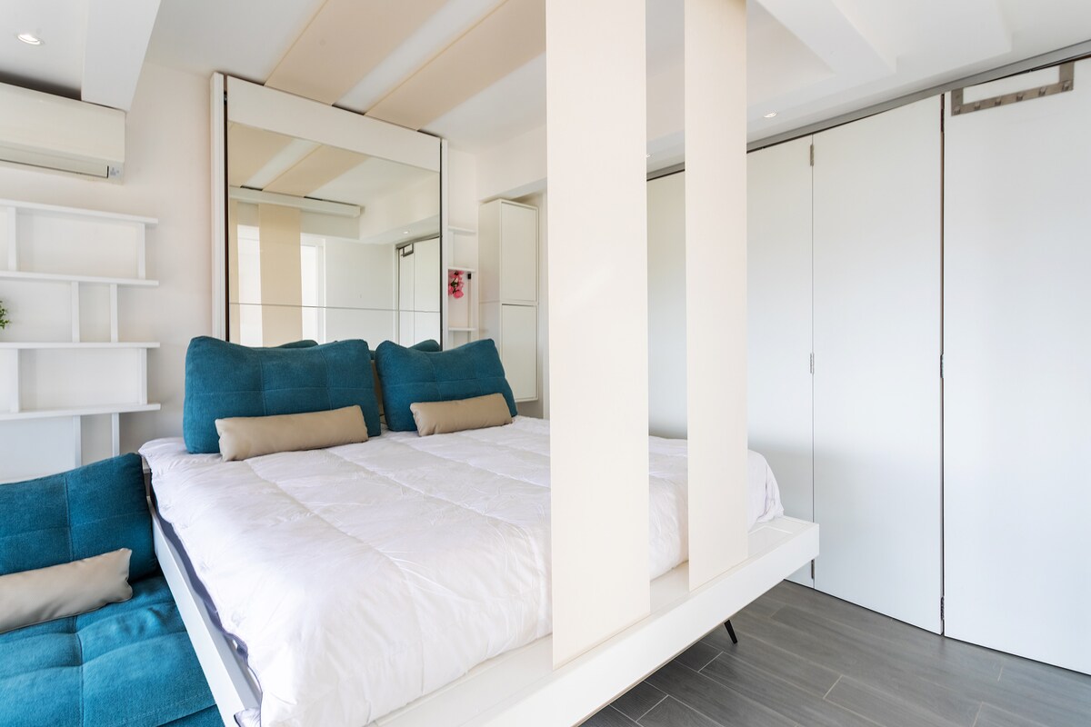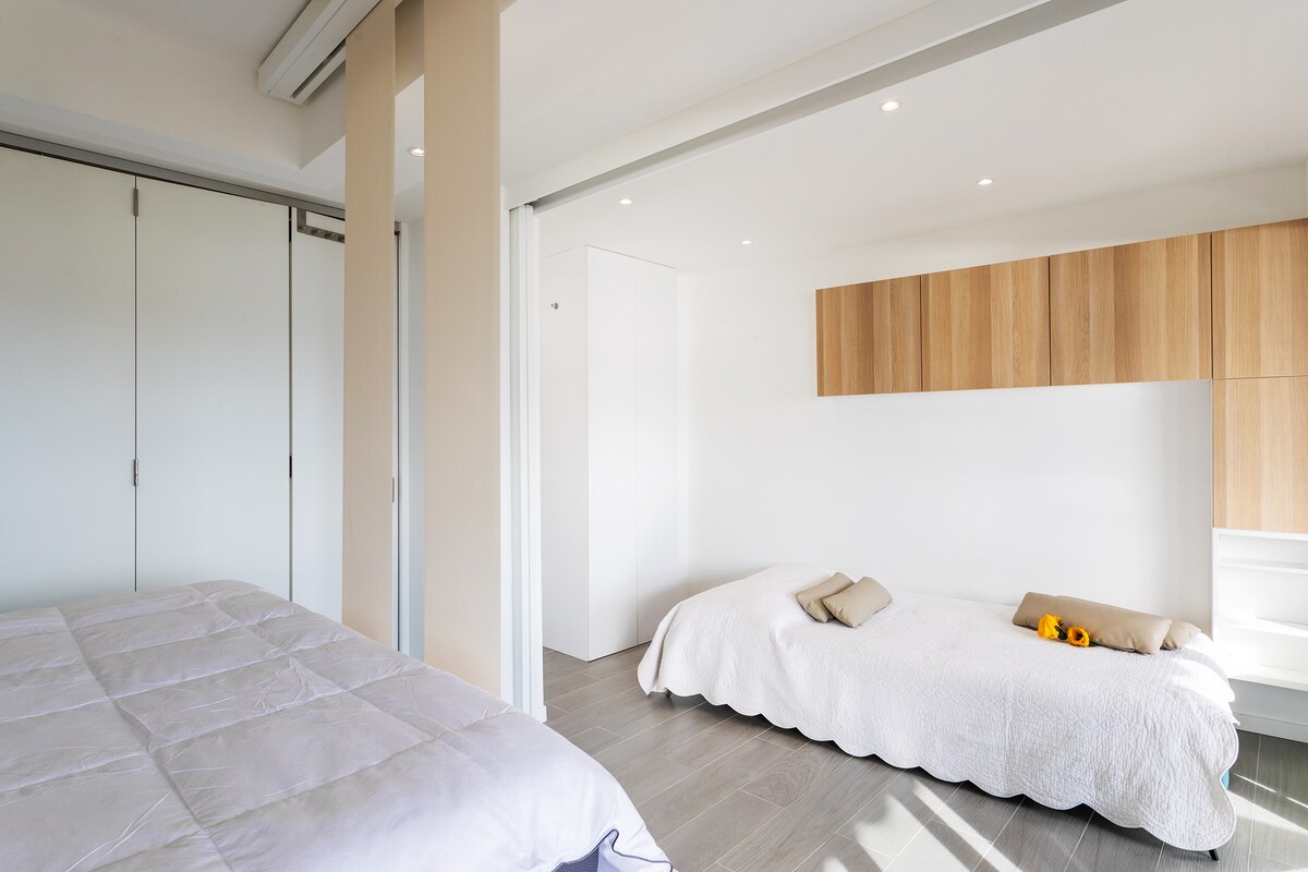 Inside, it has a fully equipped kitchen, a sleeping area with 1 single sofa bed and a removable partition that closes to create 2 separate sleeping spaces and a fold-down double bed, 1 television, a beautiful shower room with toilet. Fully equipped kitchen corner, dishwasher, microwave oven, Nespresso coffee machine, kettle, toaster and all necessary cooking equipment. A washer-dryer in the bathroom. Terrace with sublime sea view including a lounge and dining area.