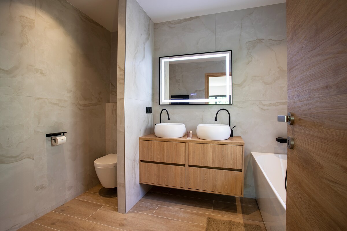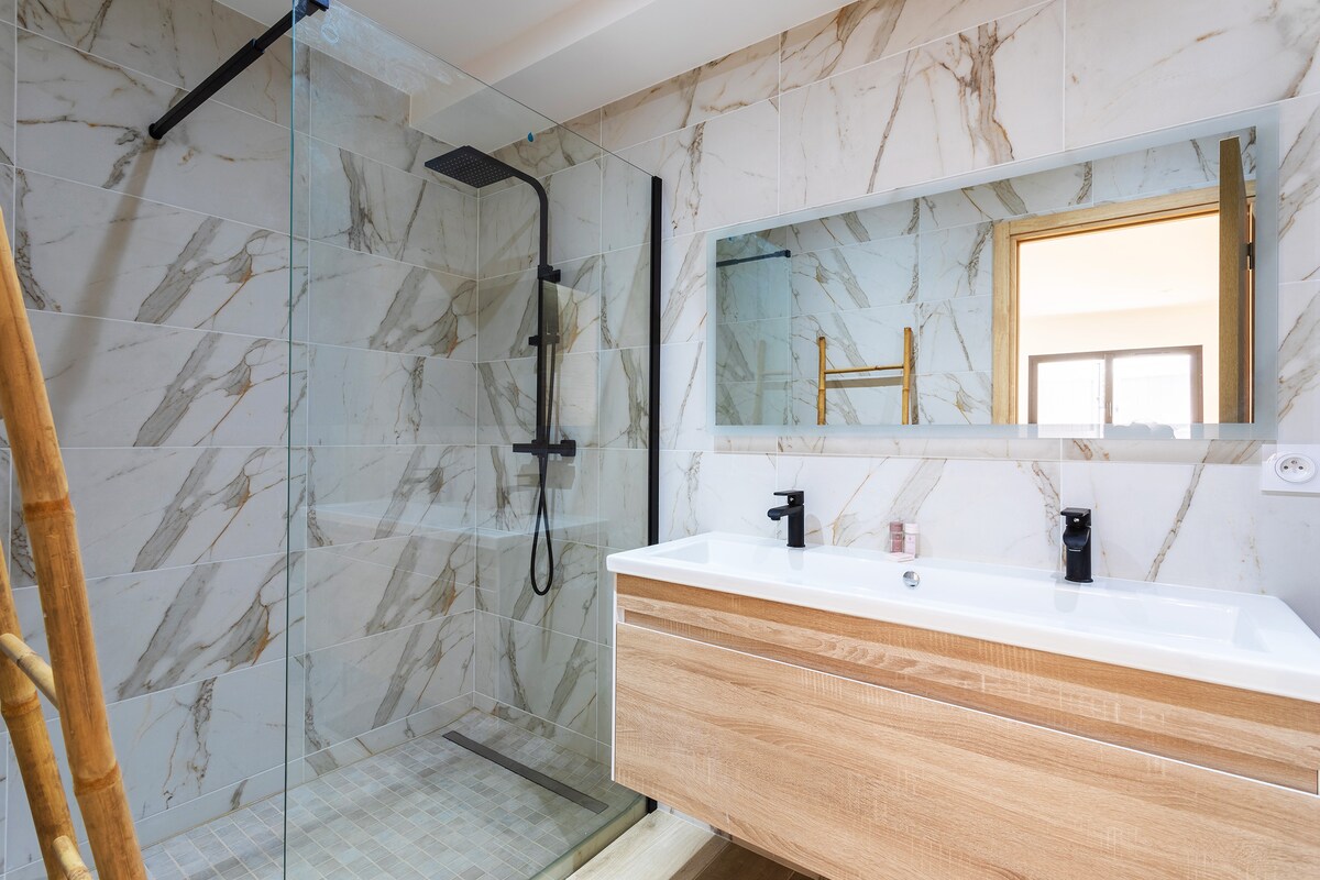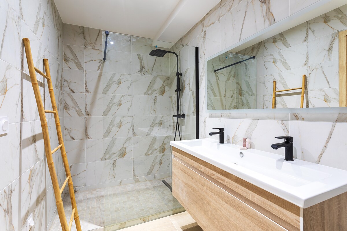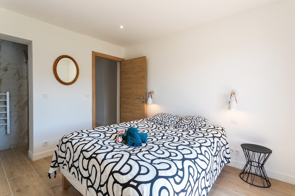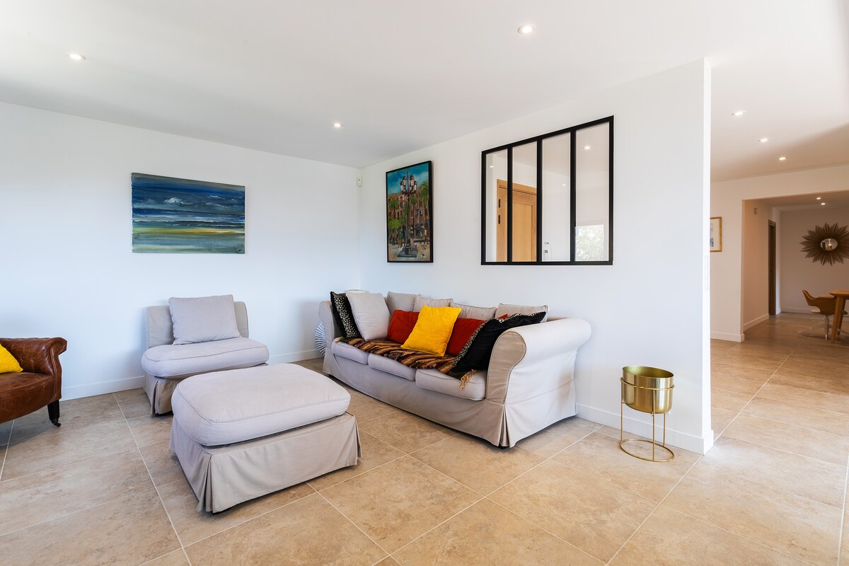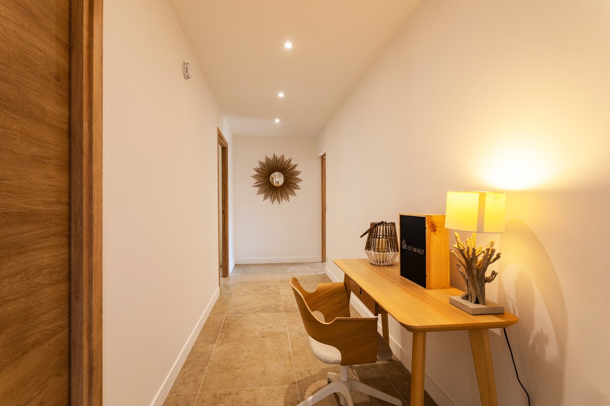 On the inside, this holiday rental on 2 levels has 4 bedrooms with 3 160cm beds and 1 140cm bed and a living room with a sofa bed on the ground floor, 3 shower rooms and 1 bathroom, 5 toilets, a modern kitchen, a large living room on the 1st floor as well as on the ground floor, and a balcony.