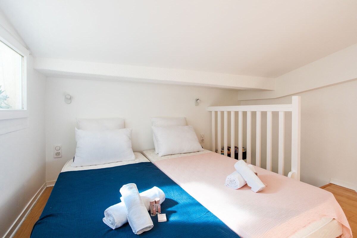 - Mezzanine with two single beds (can be combined into a large bed)