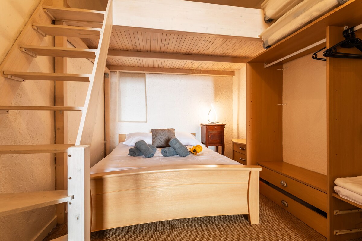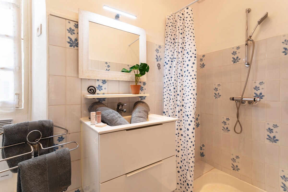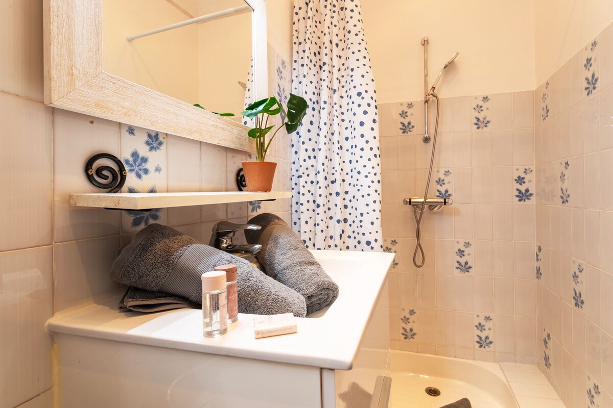 The apartment includes 1 bathroom with a shower and toilet. It has 2 beds, a double bed and a single bed, accommodating up to 3 people.