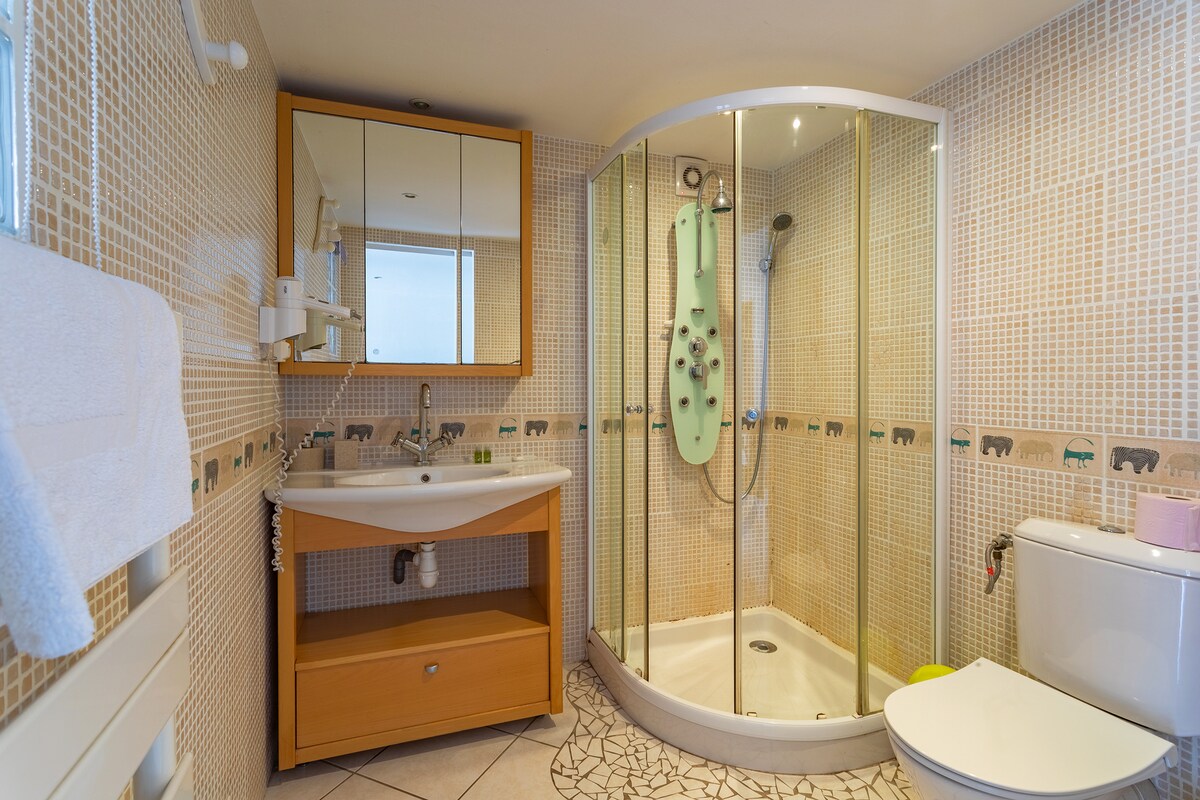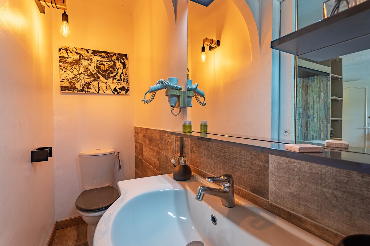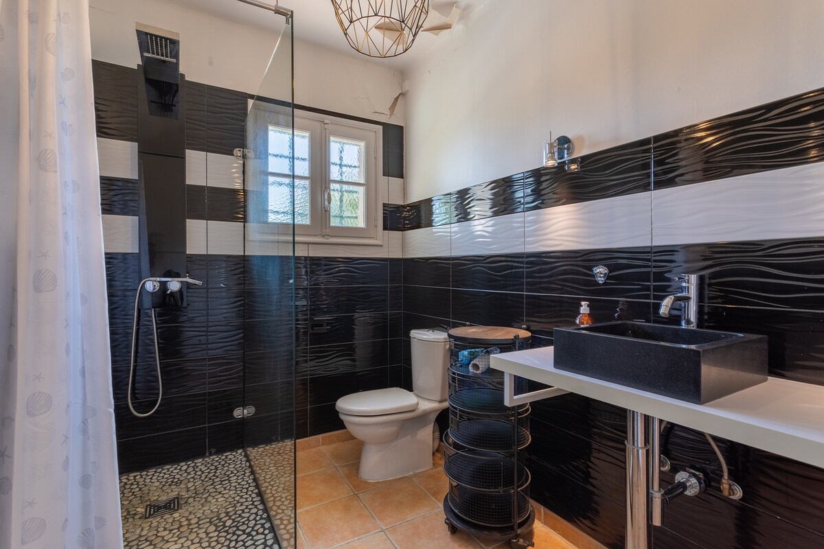 The main part on one level with the entrance consists of a fully equipped kitchen area, living / dining room with fireplace, 2 bedrooms (2 * 90 + 1 * 160), a bathroom with Wc, a Wc independent and a large terrace equipped with dining area for 10 people.