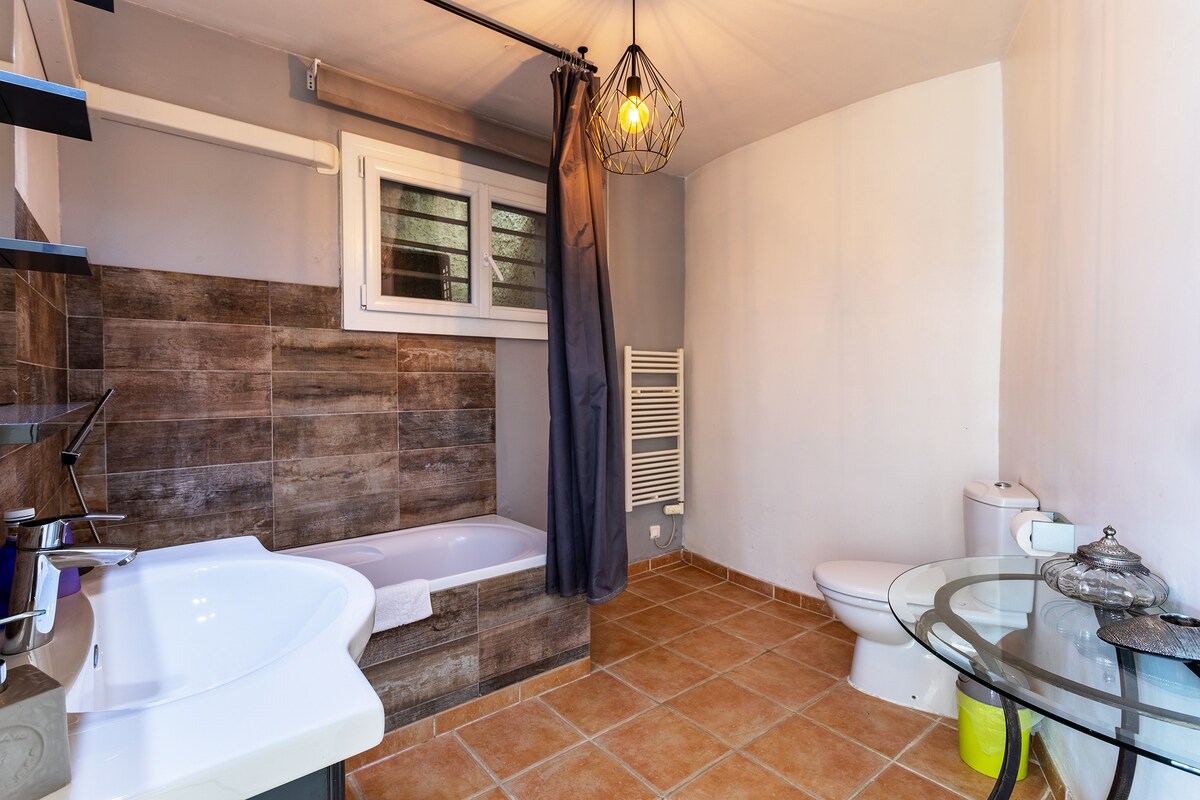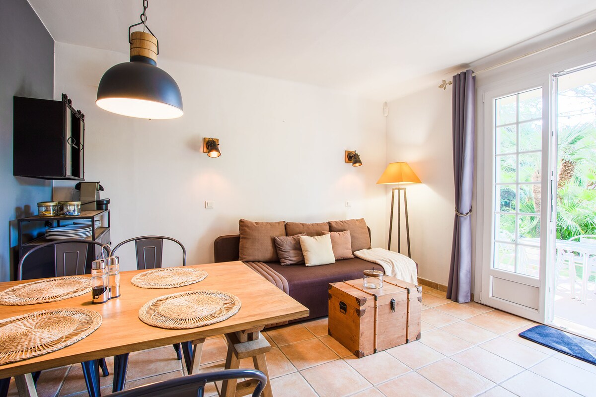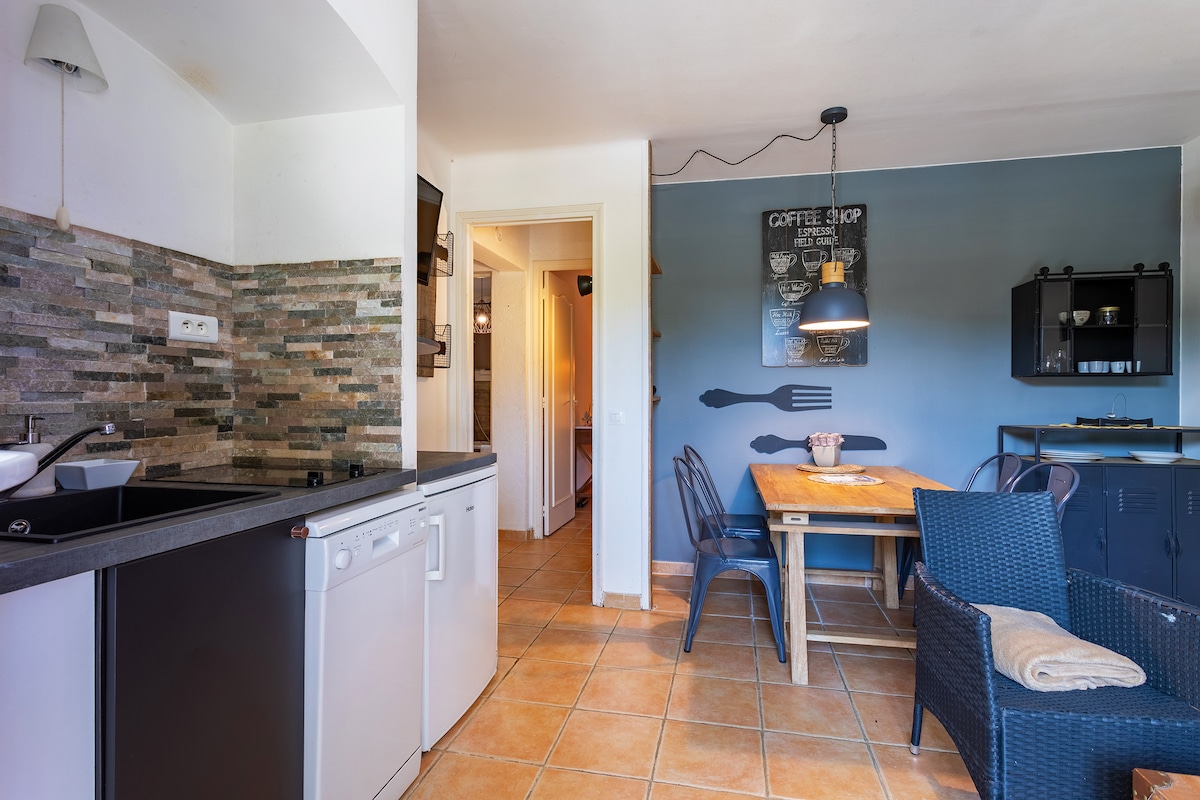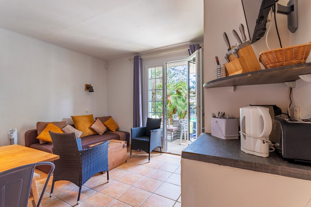 On the garden level, 5 apartments equipped either in studio or in 2 rooms each sleeping 2 people and a bathroom with wc in each, a large terrace along the property.