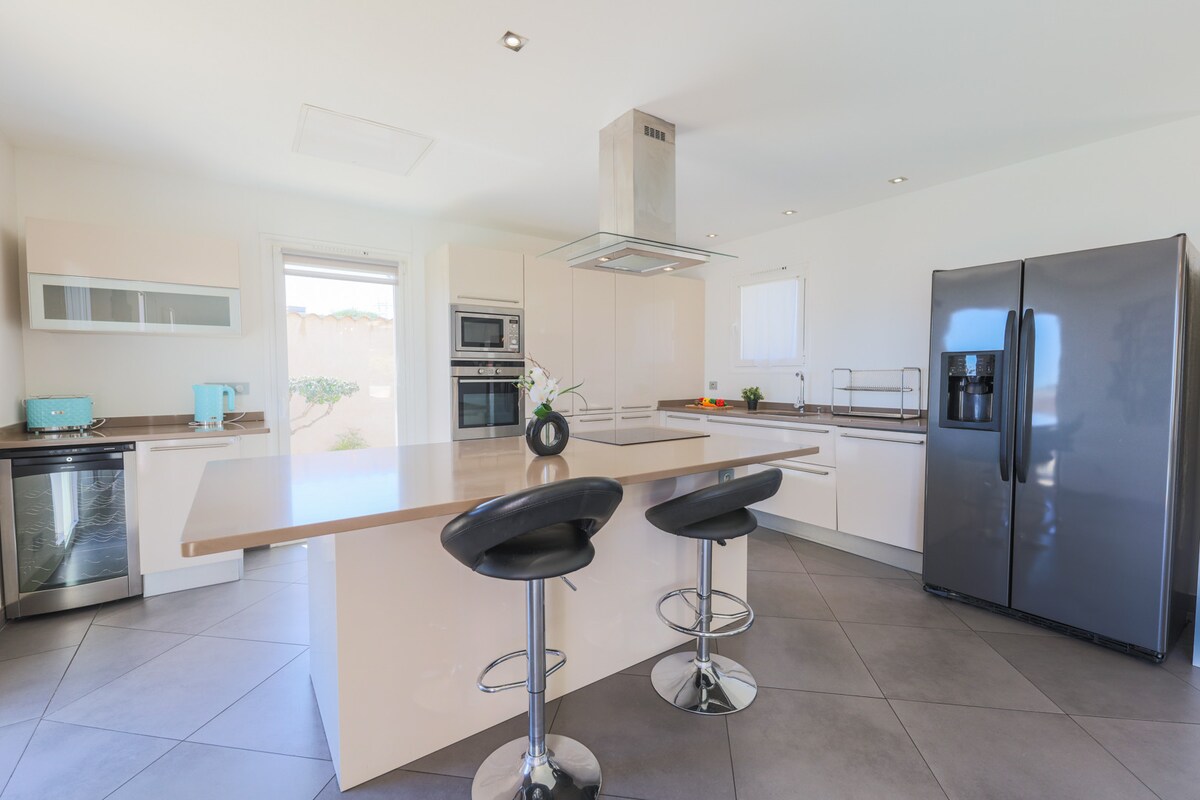 This villa has quality furnishings and comprises an open-plan fully equipped kitchen opening onto the living room with dining area, 3 bedrooms, 2 bedrooms with 1 Queen size bed (160 cm) each and the 3rd with a double bed (140 cm) and 2 bathrooms with bathtub as well as 4 toilets. A laundry room with washing machine and tumble dryer is located in the basement. It is fully air-conditioned.
