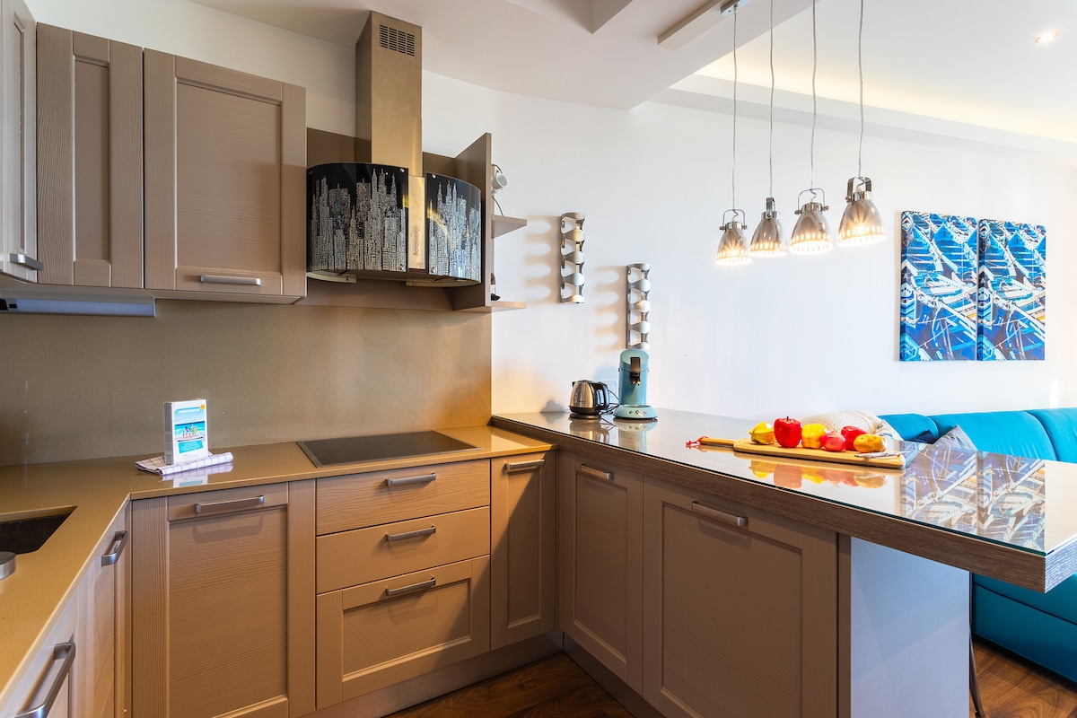Functional kitchen including: oven, microwave, dishwasher, coffee machine, hob and utensils.