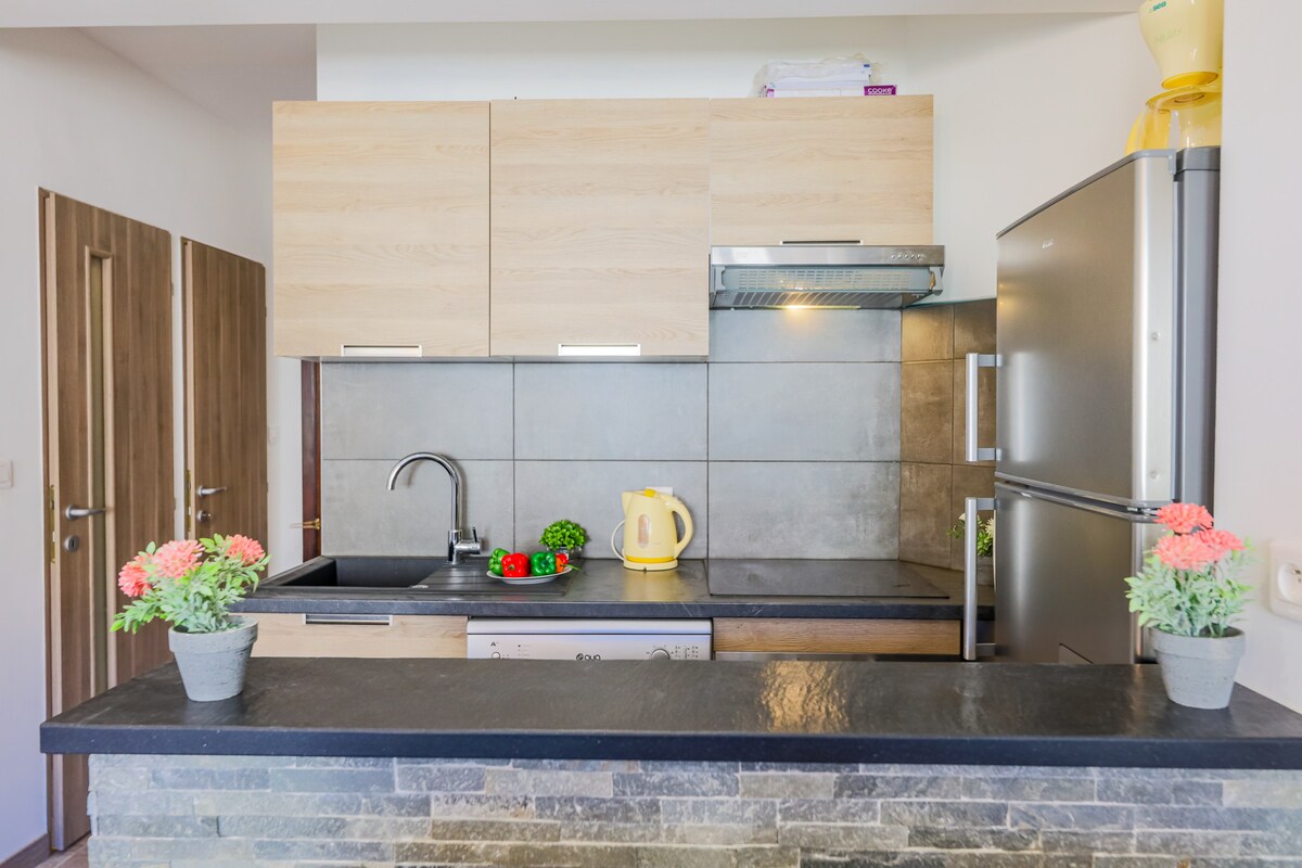 It consists of an equipped open kitchen with a dining area, a living room with a double sofa bed (140 cm) and a bedroom with 1 double bed (140 cm) and a bathroom with a shower and toilet.
