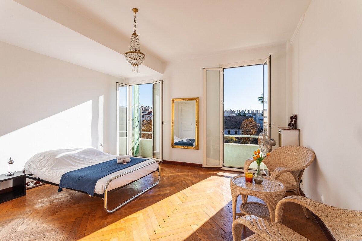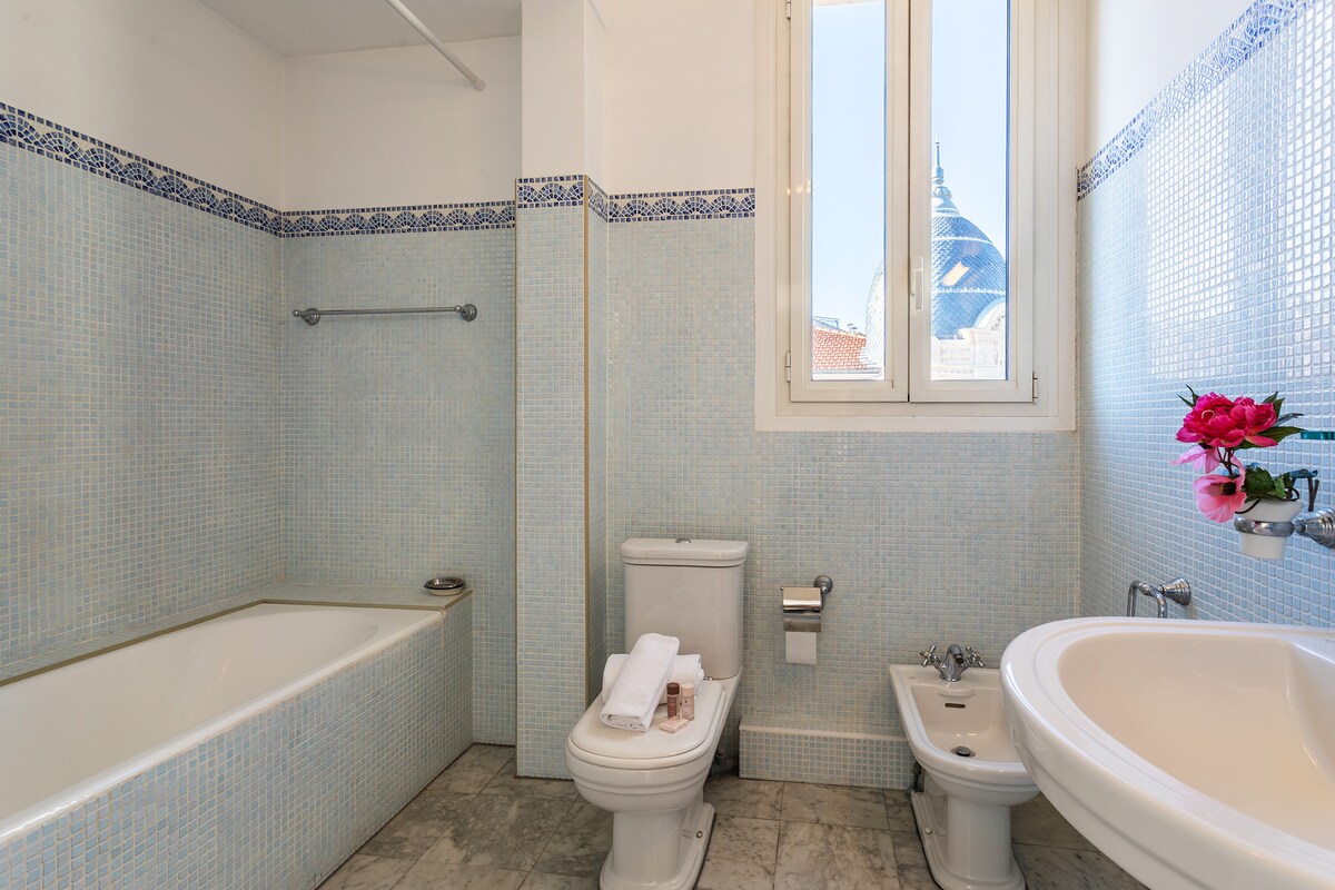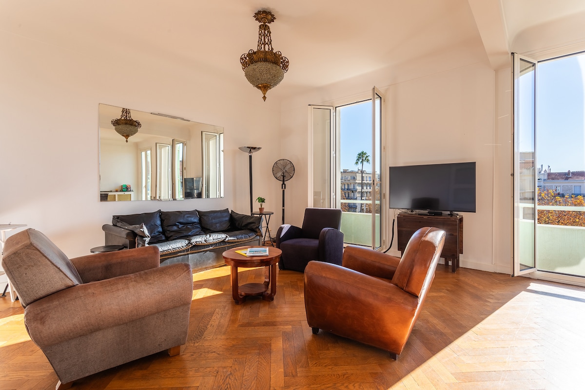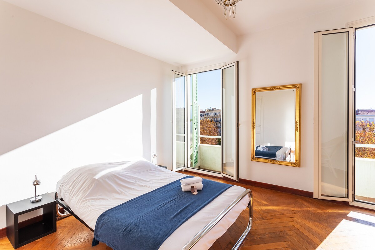 This charming 115m2 holiday rental apartment located in Nice is equipped to accommodate 4 people.It consists of a fully equipped independent kitchen, a spacious living/dining room, two bedrooms with 140cm double beds, two bathrooms, one with a bathtub and 1 toilet, the other with a shower and a separate toilet.