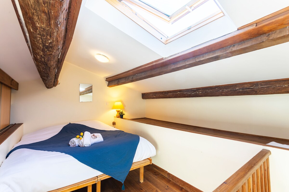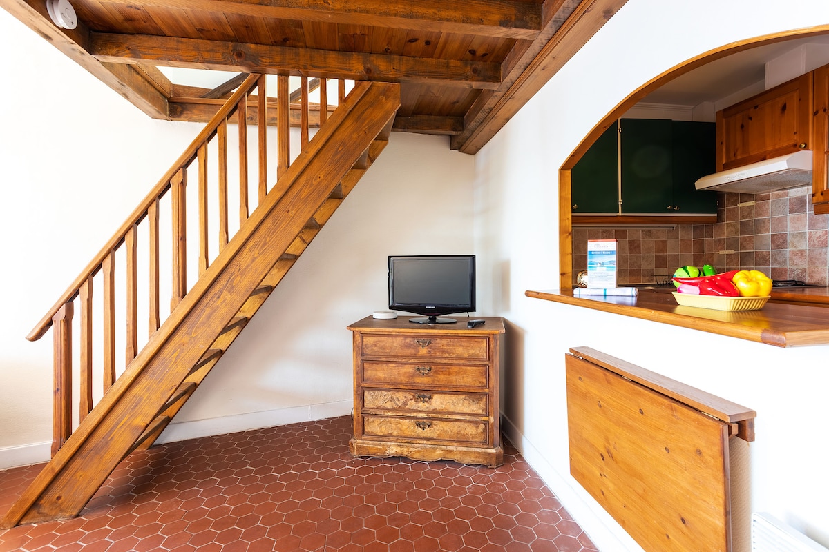 It consists of a small equipped kitchen, a sleeping area on the 1st floor with 1 double bed (140 cm), a living room with a dining area and a sofa bed for 2 people, a bathroom with shower and toilet.