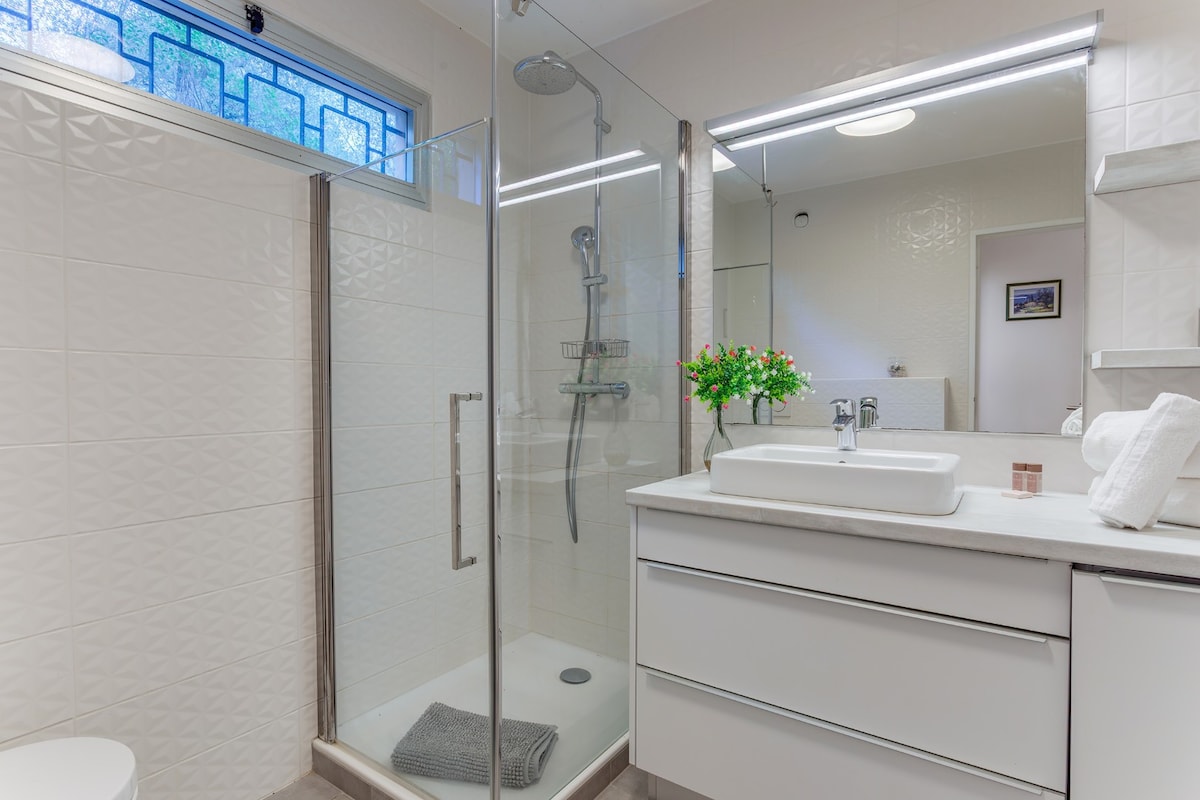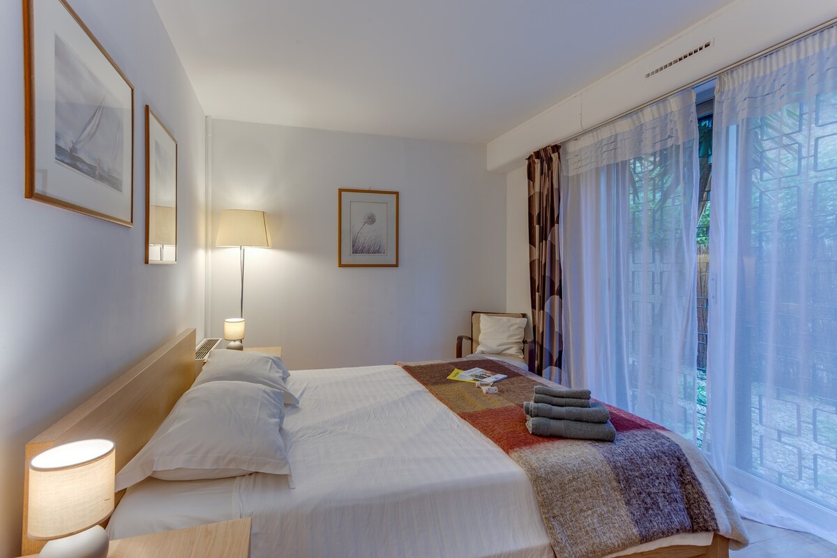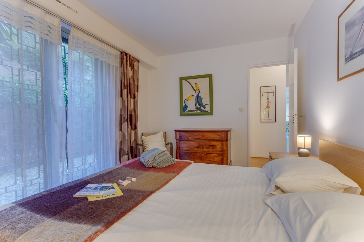 The Jardin Figuiers is a holiday rental apartment located in Villefranche S/ Mer, with an area of 85 square meters and can accommodate 5 people. It is located on the ground floor of a beautiful residence with a swimming pool.It consists of a fully equipped independent kitchen, a living - dining room opening onto a furnished terrace with a dining area and sea view, a bedroom with 1 Queen Size bed and another bedroom with a sofa bed and a single bed, a bathroom with a shower and 2 toilets.