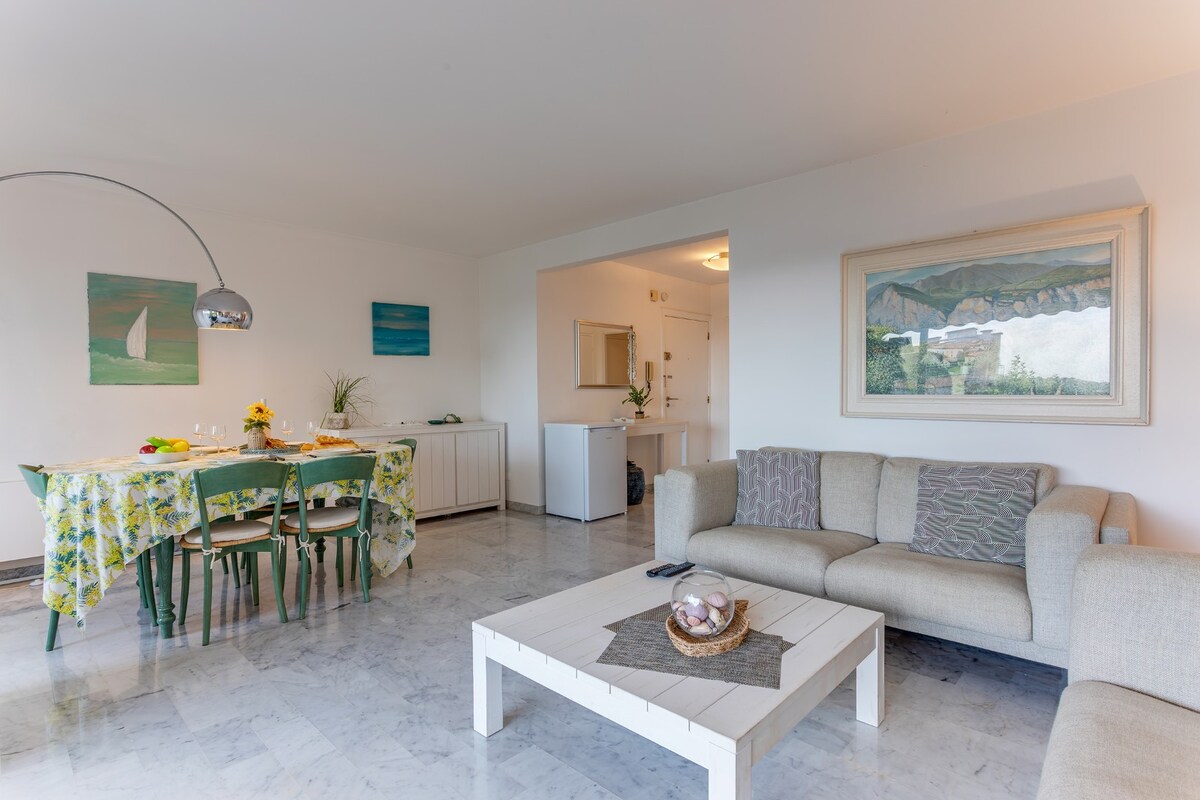 It consists of a fully equipped independent kitchen, a living - dining room opening onto a furnished terrace with a dining area and sea view, a bedroom with 1 Queen Size bed and another bedroom with a sofa bed and a single bed, a bathroom with a shower and 2 toilets.