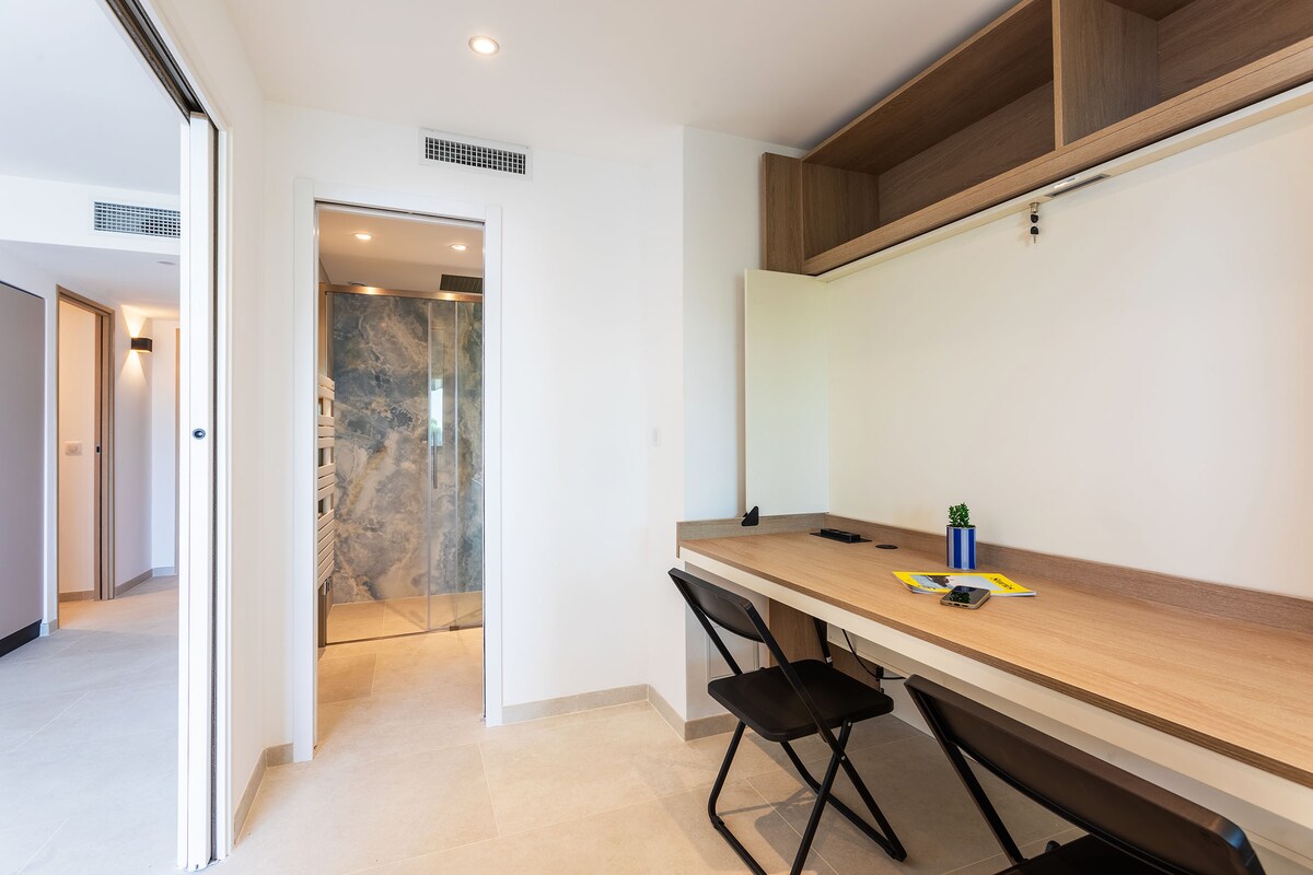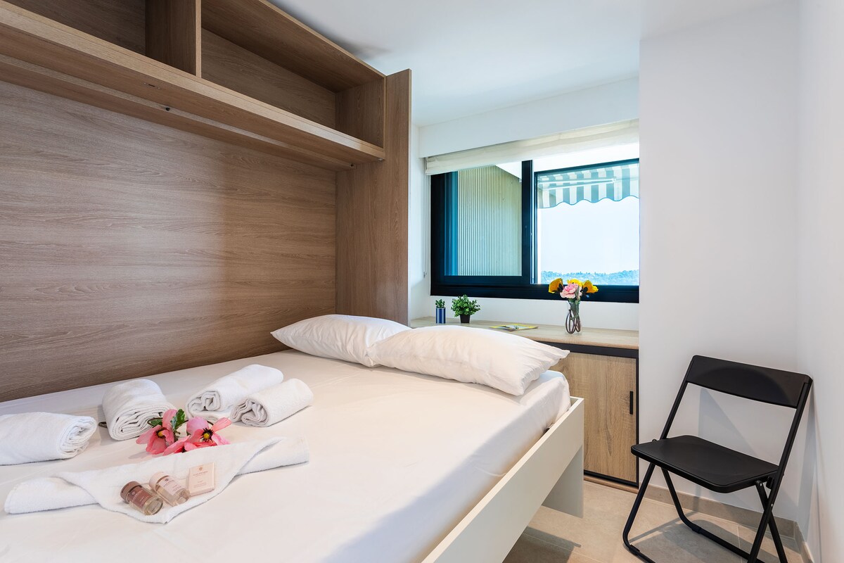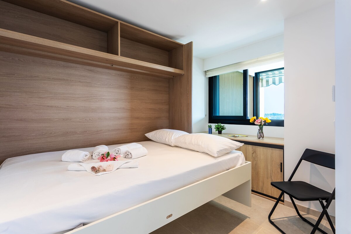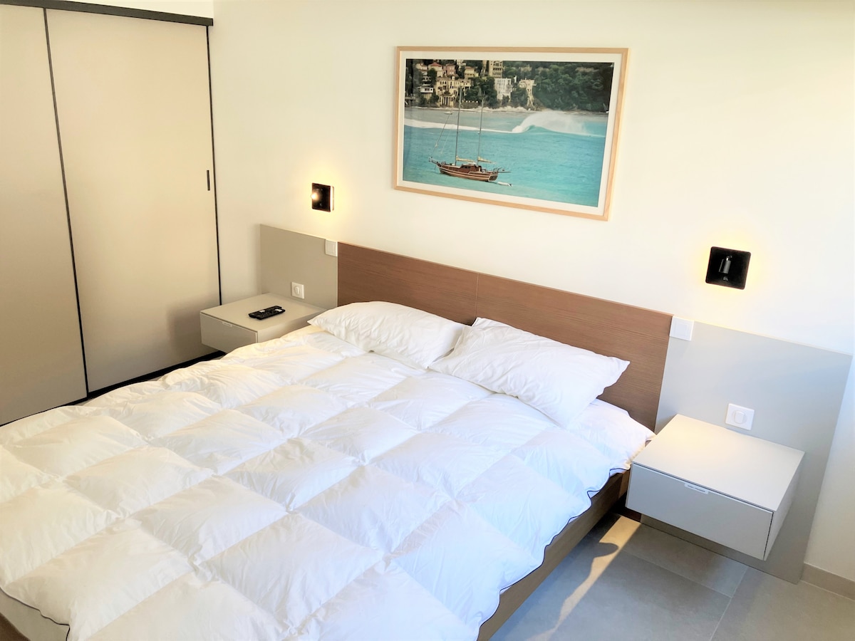 The Agrianthe Palms is a holiday rental apartment that has been completely renovated with luxurious amenities. It is located in Villefranche S/ Mer on the 3rd floor with a lift of a beautiful residence with a swimming pool. It also has air conditioning and a parking space. Its area is 75 square meters and it can accommodate 5 people.It consists of a fully equipped independent kitchen, a living room with a sofa bed for 1 person - a dining area with a sublime sea view, a bedroom with 1 Queen Size bed, a bathroom with a shower, another bedroom / office with a retractable double bed, a bathroom with a shower and a separate toilet.