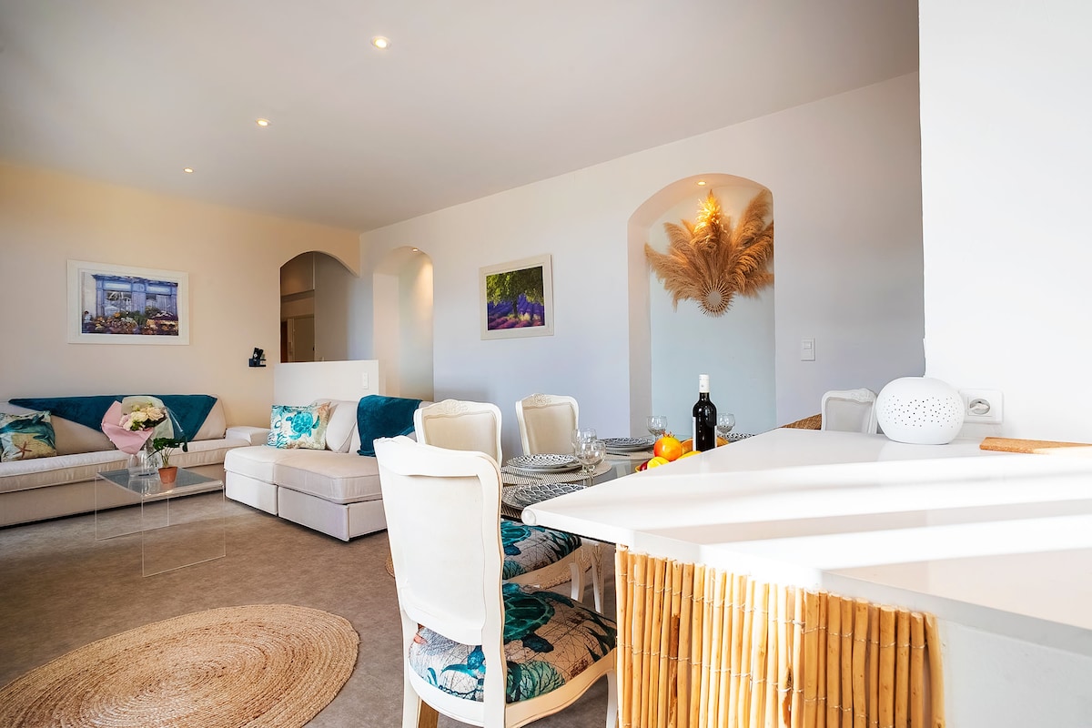 It consists of a beautiful living room with a smart Tv with a large screen, a fully equipped American kitchen and a dining area overlooking the balcony, a 3-seater sofa, 2 small single sofa beds of 90x190cm and a bedroom with 2 single beds of 90x200cm that can be combined into a large 180cm bed. You will also find a bathroom with a large shower and toilet.