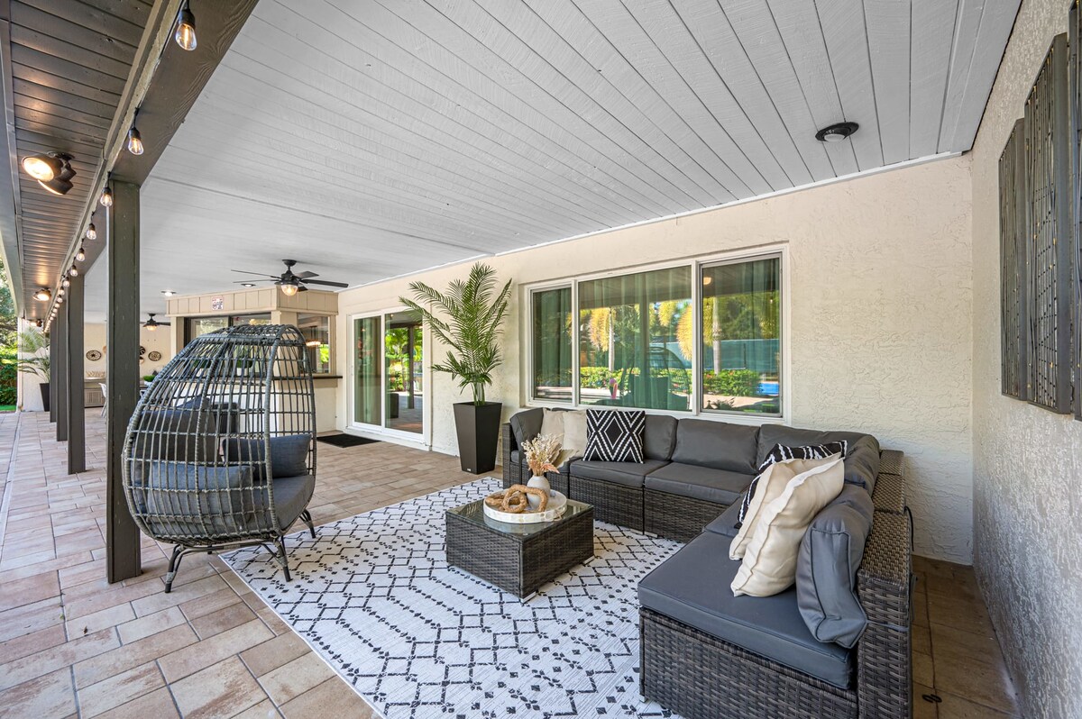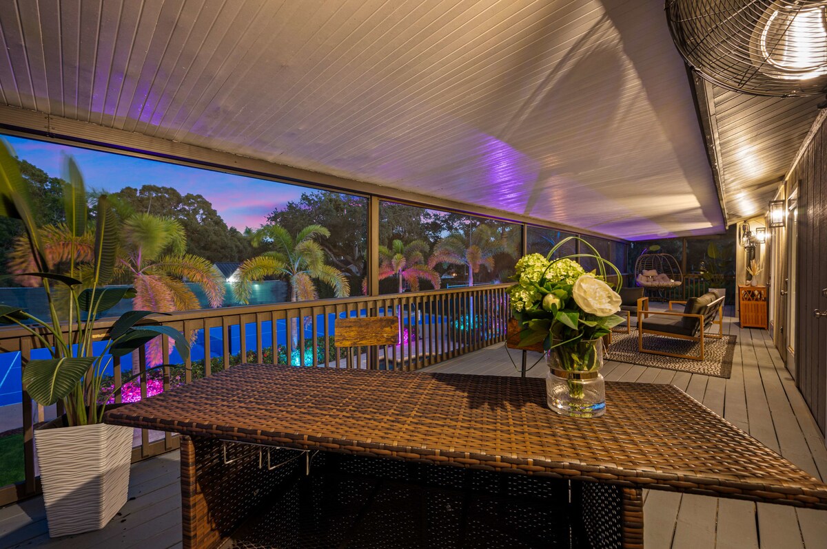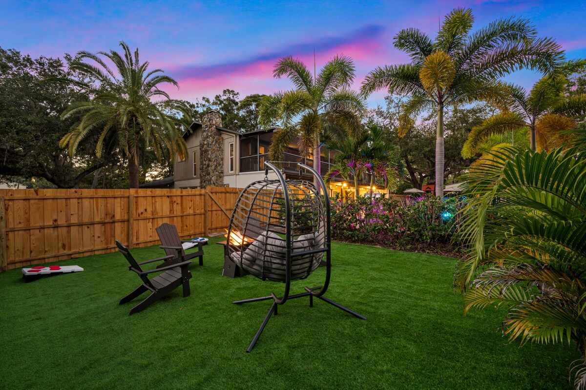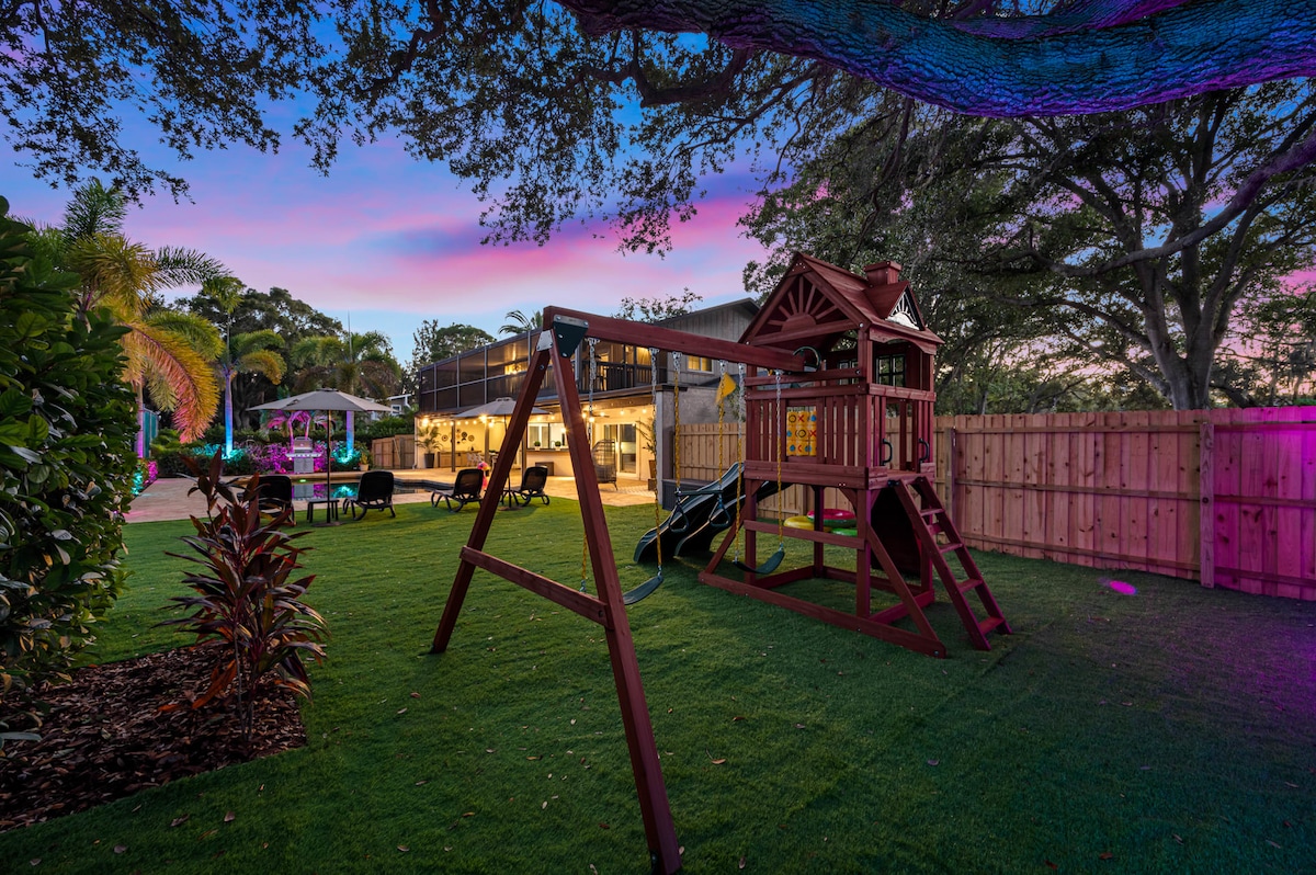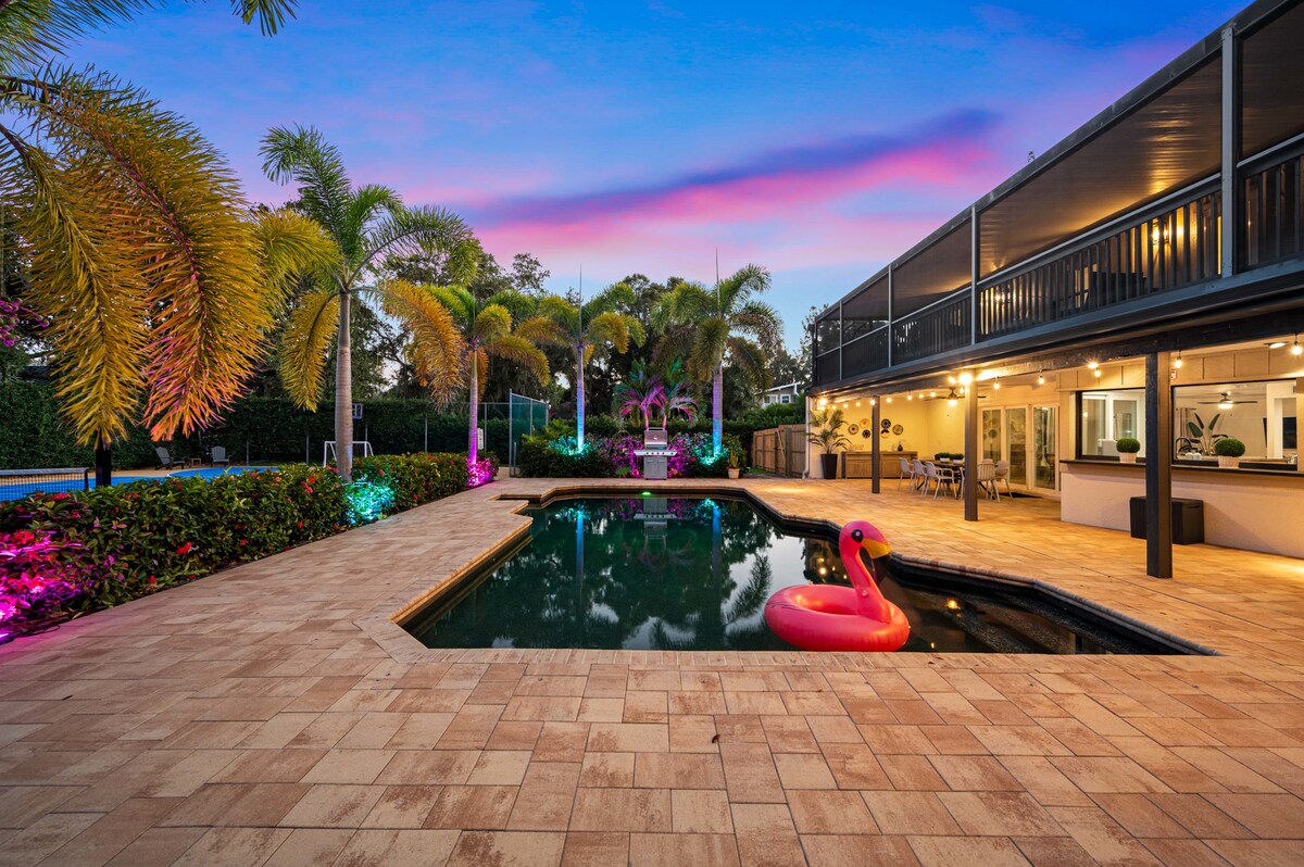Welcome to a truly exclusive 7BR coastal oasis. This luxury estate offers a private, resort style experience with a sparkling pool, professional basketball courts, and a cozy fire pit lounge. Inside, discover the ultimate Game Room featuring pool, air hockey, and ping pong. Four dedicated King Suites guarantee unmatched comfort for your group. Perfectly located near pristine Indian Rocks Beach and the famous Hollywood Boardwalk. Adventure and upscale relaxation await.