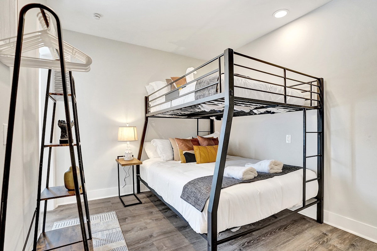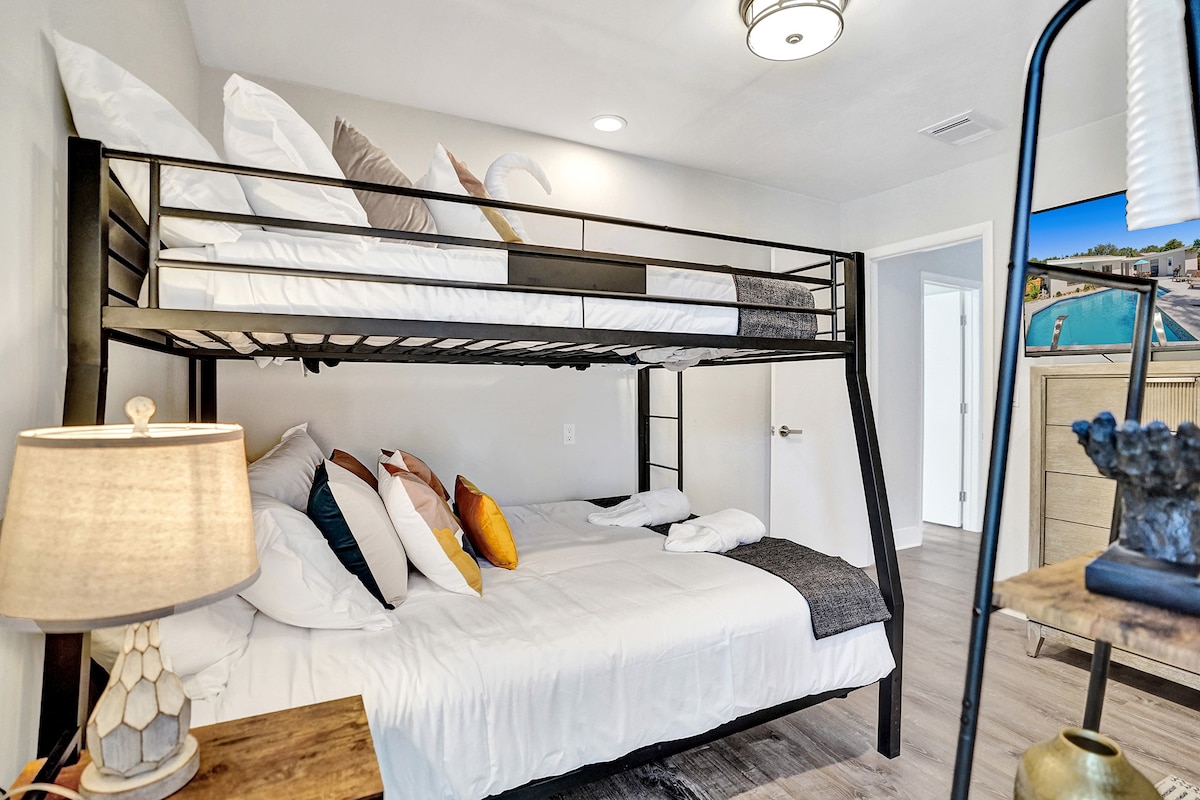 6. Bedroom with a BUNK BED (Full over Queen), 55" TV, dresser, standing rack and has access to the game area.