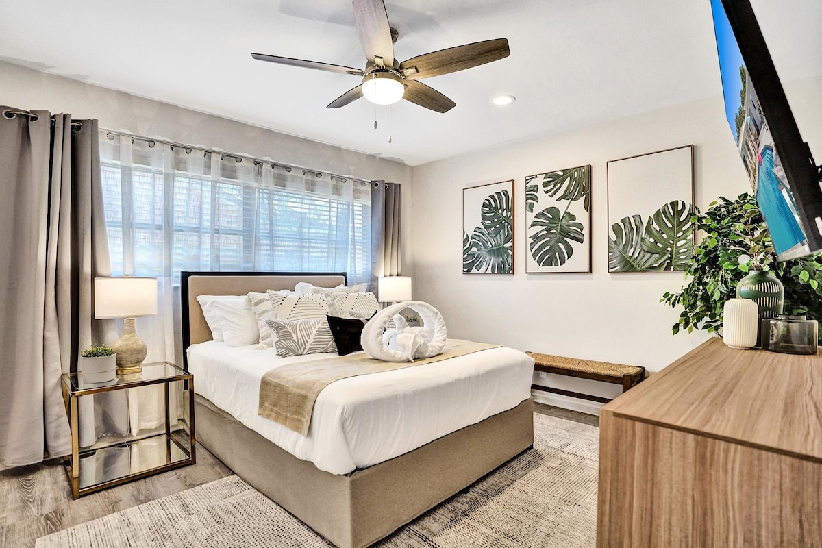 5. Bedroom with a (Master) KING SIZE BED, 55" TV, Dresser, hangers, full closet, access to a full private bathroom and has access to a pool area and patio.