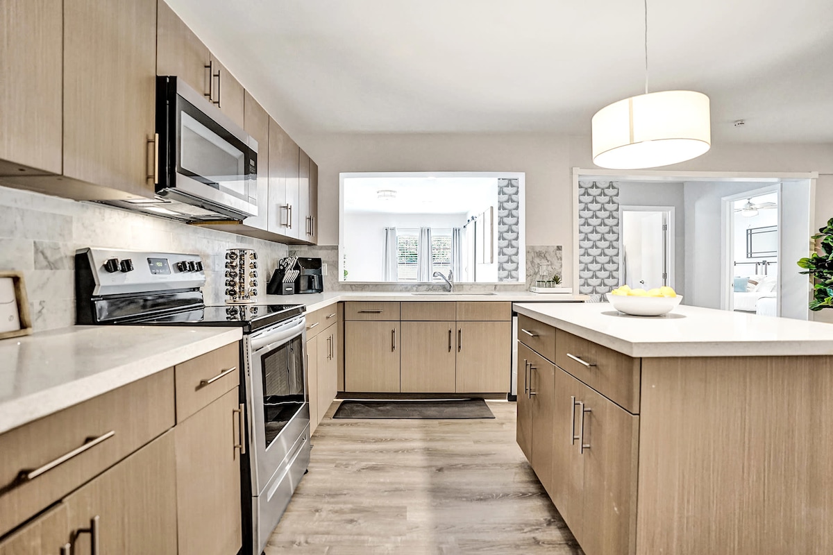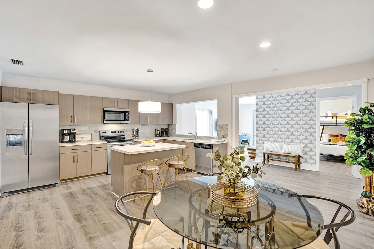 Kitchen - Spacious kitchen with an island, a breakfast table seats 4 guests, and additional 3 seats on a nook. The kitchen is fully stocked with dishware, cookware, pots, and pans. It is also stocked with spices and coffee.