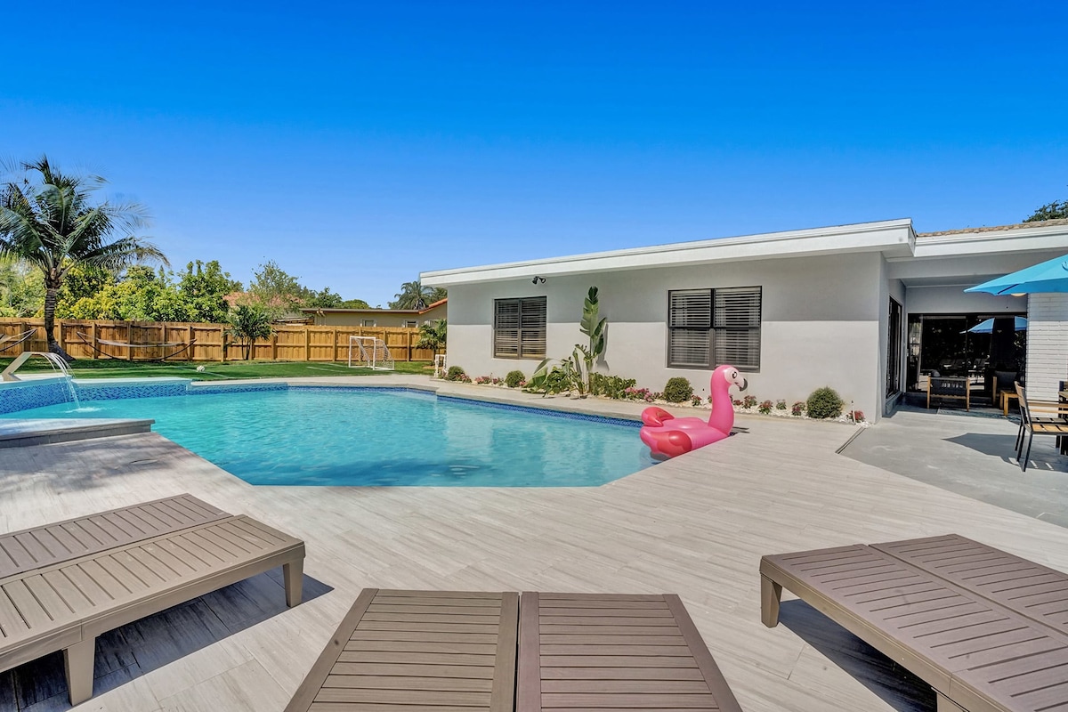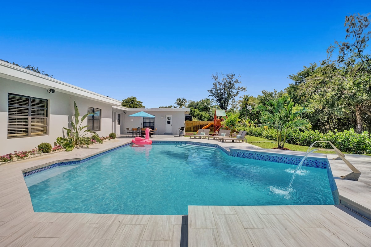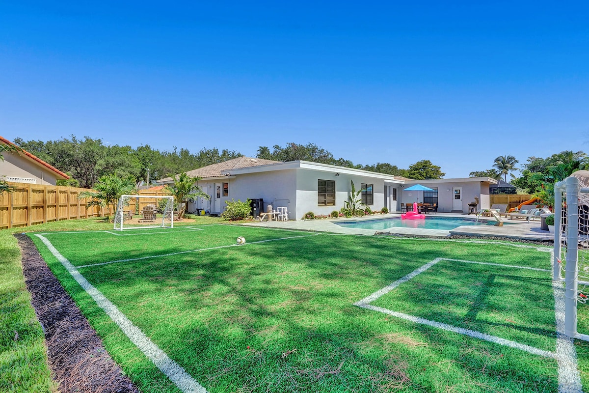 This unique home is newly renovated and has 7 bedrooms and 4 baths, it is the perfect choice for your next family get-together, with many memories to cherish. A large backyard with a private pool and plenty of outside seating, a mini-soccer field, and a kids' playground, are just a few to mention.