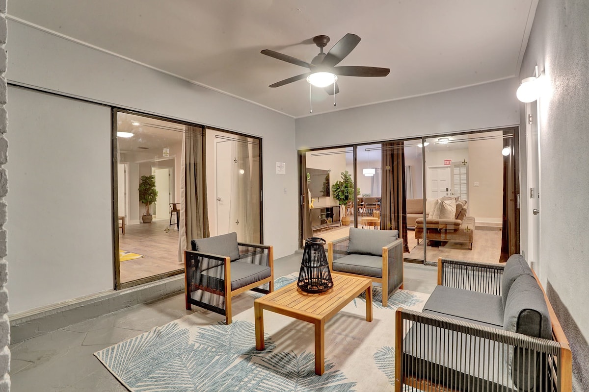 Living room - Spacious with a sectional couch, additional seating area, and a 65" TV, access to the pool area