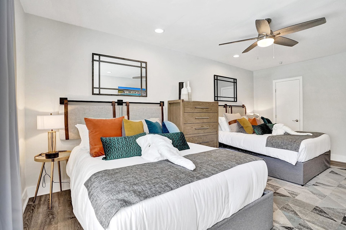 7. Bedroom with TWO QUEEN SIZE BEDS, 55" TV, dresser, hangers and has direct access to shared bath with views the pool.