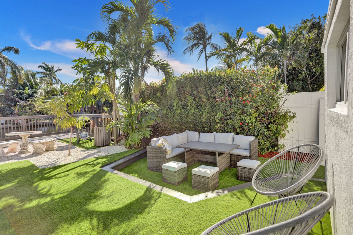 Outdoor- Fenced-in backyard with outdoor dining picnic table area, large comfy outdoor seating, views of the canal, pool loungers, and also a private swimming pool. *Please note that the pool has natural darker stone tile, so the water will have a more natural appearance, it is serviced twice a week by a professional pool technician, also we have lots of beautiful trees around the backyard and occasionally leaves may fall in the pool in between service days."