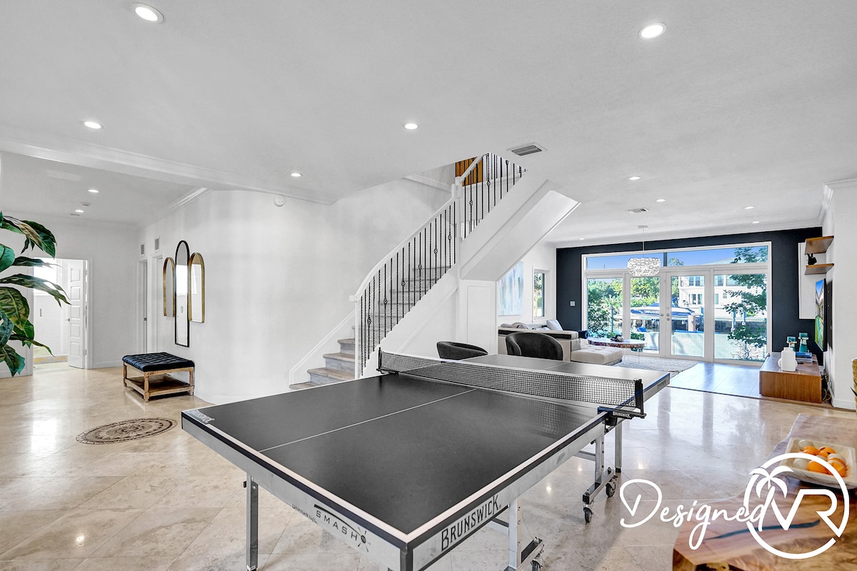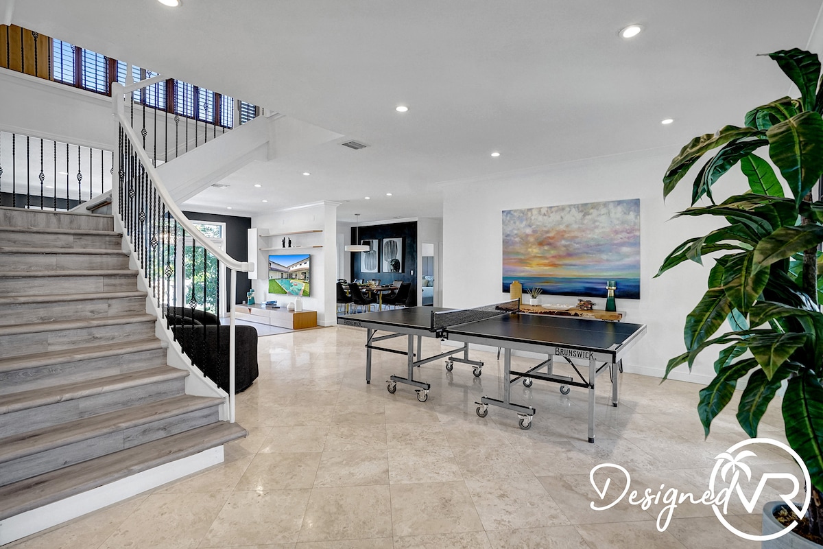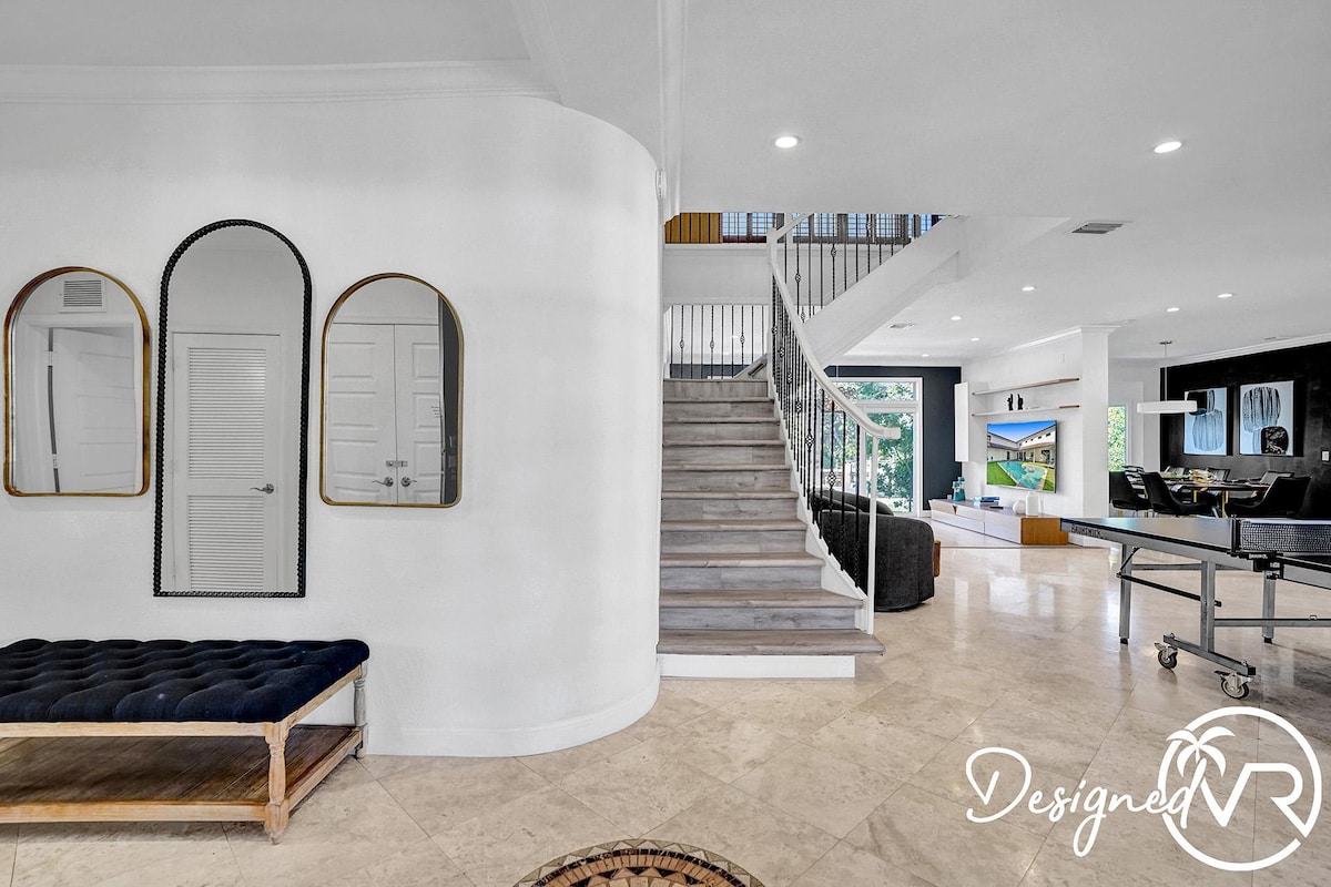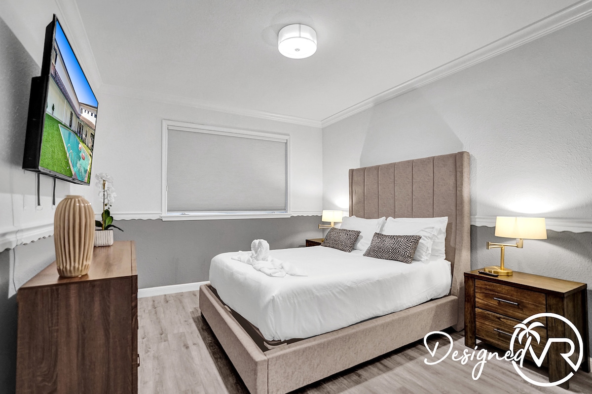 With 7 bedrooms and 5 full bathrooms, you have space designed for comfort across two floors. The first floor includes a master with a king bed, TV, walk-in closet, and direct access to the pool area, along with three bedrooms featuring queen beds. Upstairs, three additional bedrooms await - one with a double bed, one with a trundle bed with a twin, and a second master with a king bed and TV. Bedrooms 5 through 7 are located on the second floor, and a lounge area with seating, a TV, and a mini fridge offers an additional place to relax.