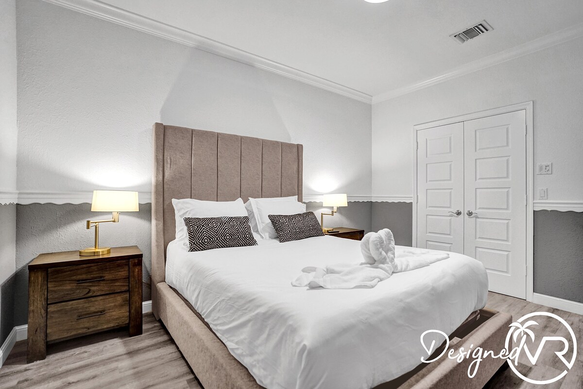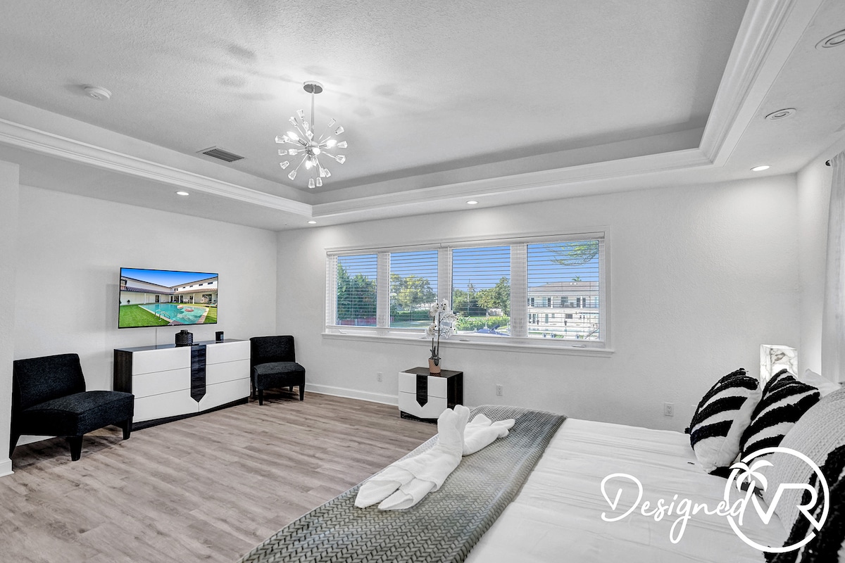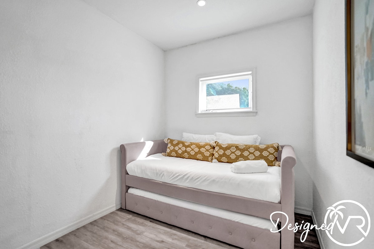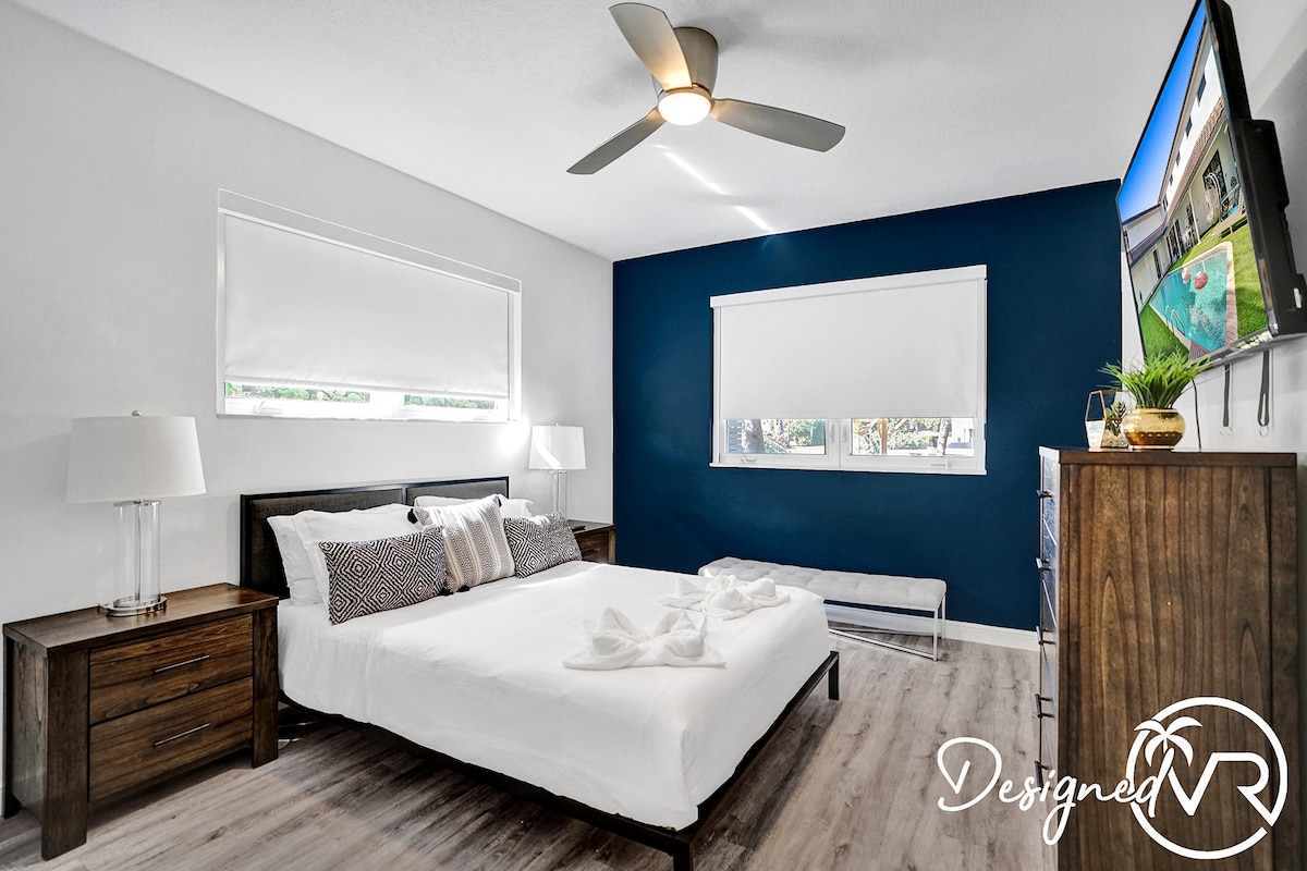 With 7 bedrooms and 5 full bathrooms, you have space designed for comfort across two floors. The first floor includes a master with a king bed, TV, walk-in closet, and direct access to the pool area, along with three bedrooms featuring queen beds. Upstairs, three additional bedrooms await - one with a double bed, one with a trundle bed with a twin, and a second master with a king bed and TV. Bedrooms 5 through 7 are located on the second floor, and a lounge area with seating, a TV, and a mini fridge offers an additional place to relax.