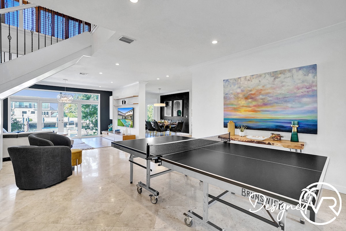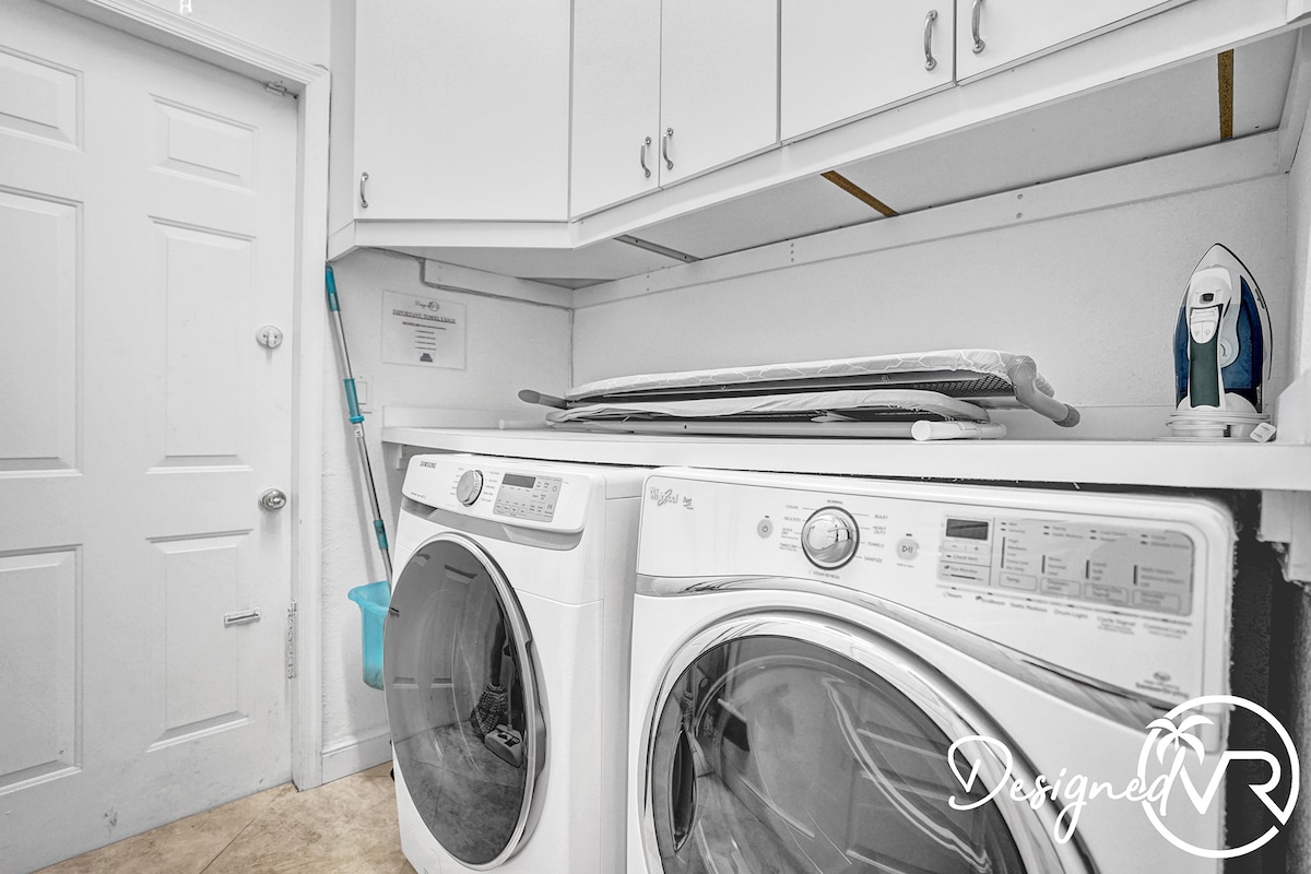 The living room offers a large sectional sofa, a 75-inch SmartTV, and a pool table for relaxed time together. The kitchen is fully equipped for preparing meals, offering plenty of counter space and cabinetry. A dining area with seating for eight and a French seating area expand the options for shared meals. The laundry room is located next to the kitchen and includes a washer, dryer, and cleaning supplies. RokuTV is available on all TVs (no cable), and guests can sign into their preferred streaming accounts.