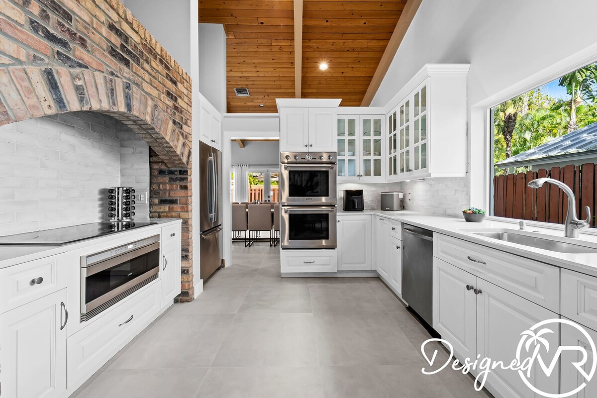 Kitchen - Spacious kitchen with high-grade appliances, and an island, fully stocked with dishware, cookware, pots, and pans. It is also stocked with spices and coffee. A breakfast nook and table are available and seat a total of 8 guests.