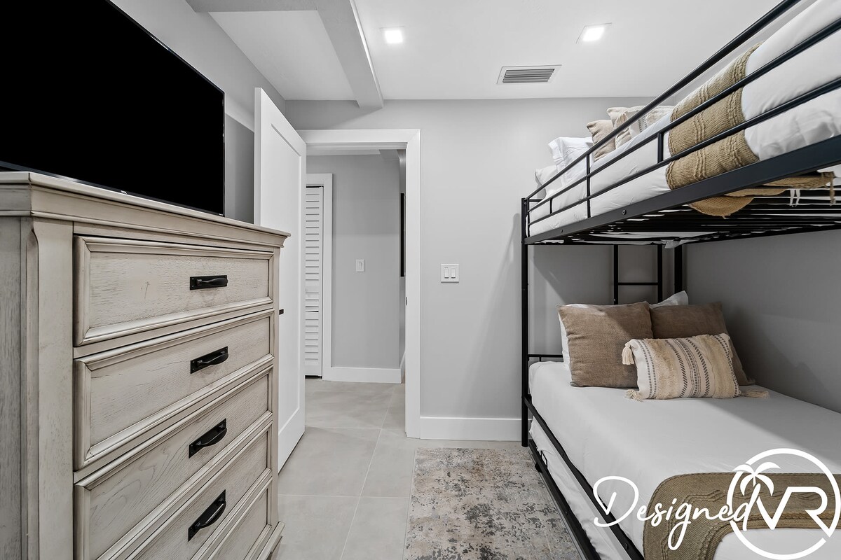 7. Bedroom with a BUNK BED (FULL OVER QUEEN), TV, dresser, hangers, and small closet.