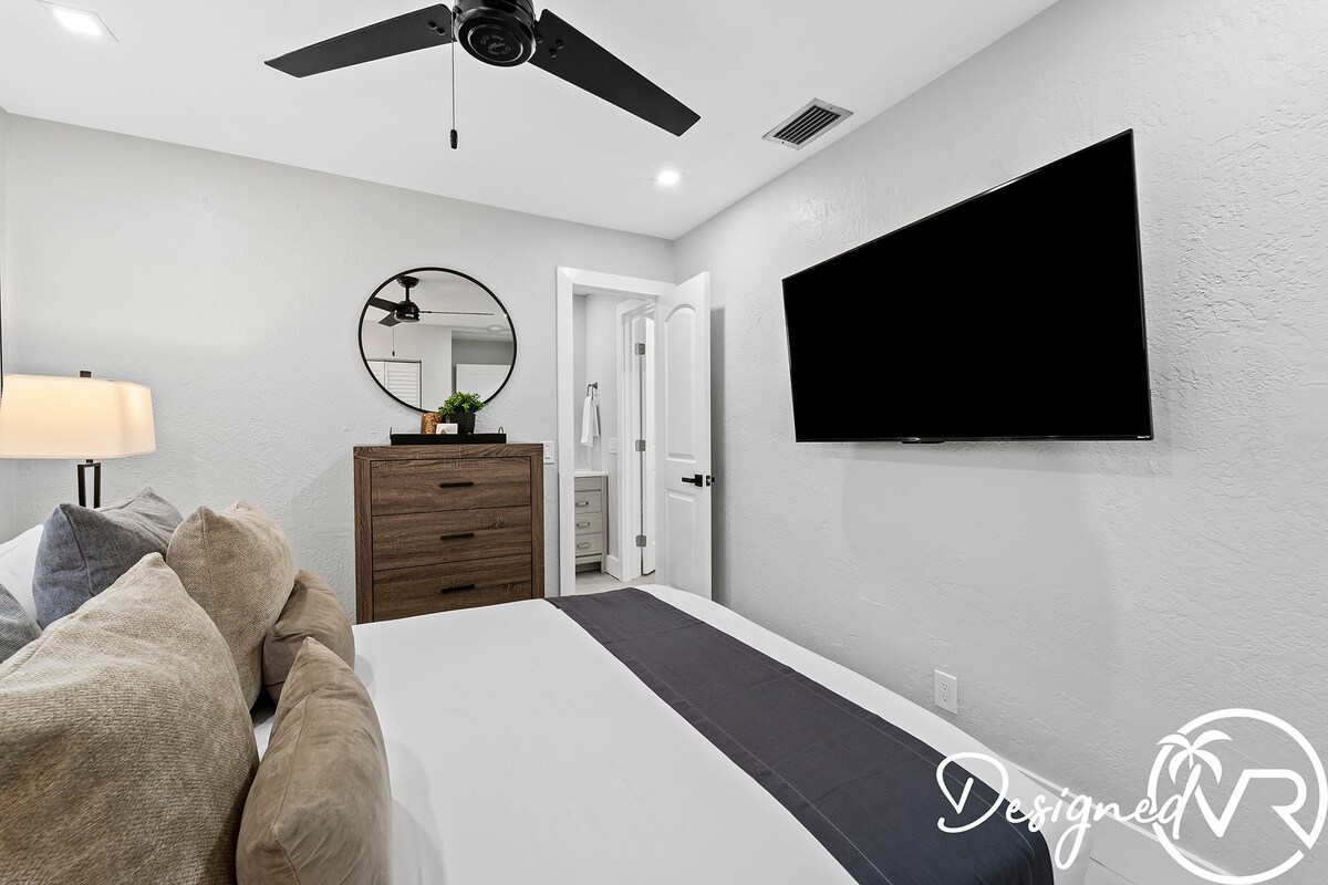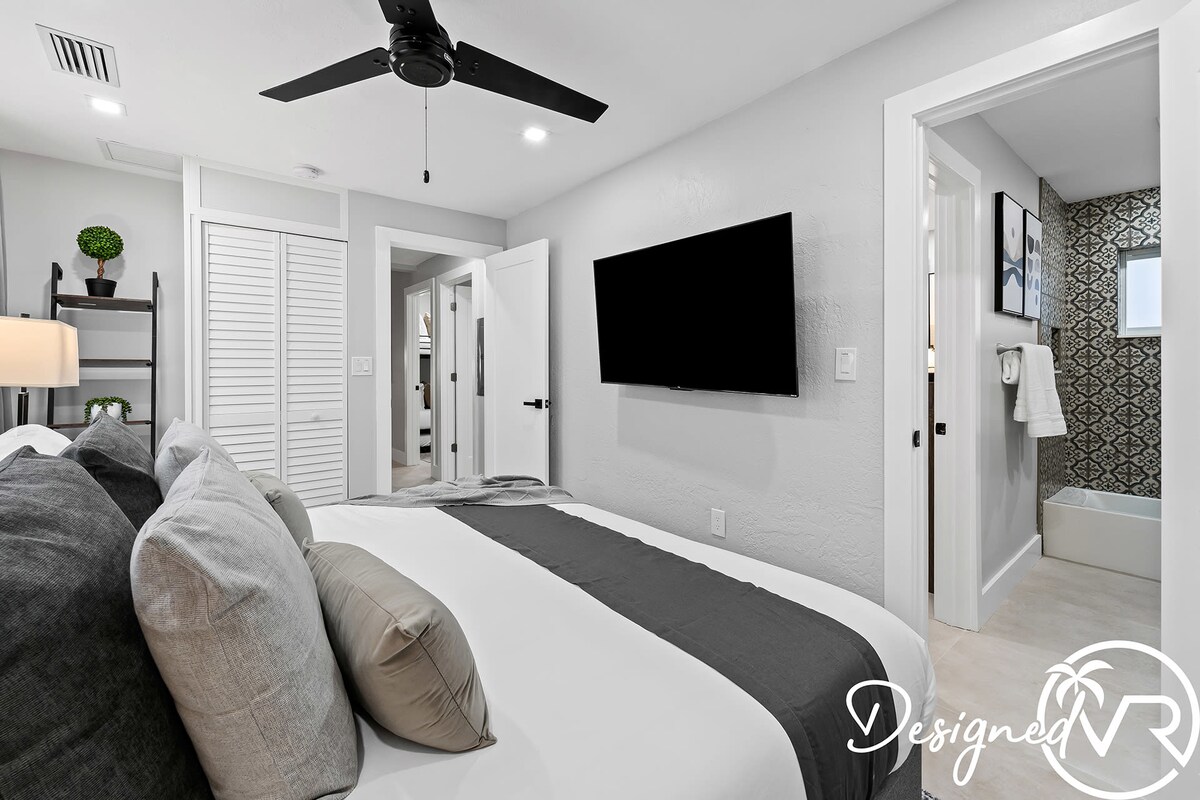6. Bedroom with a KING SIZE BED, TV, dresser, hangers, and small closet.