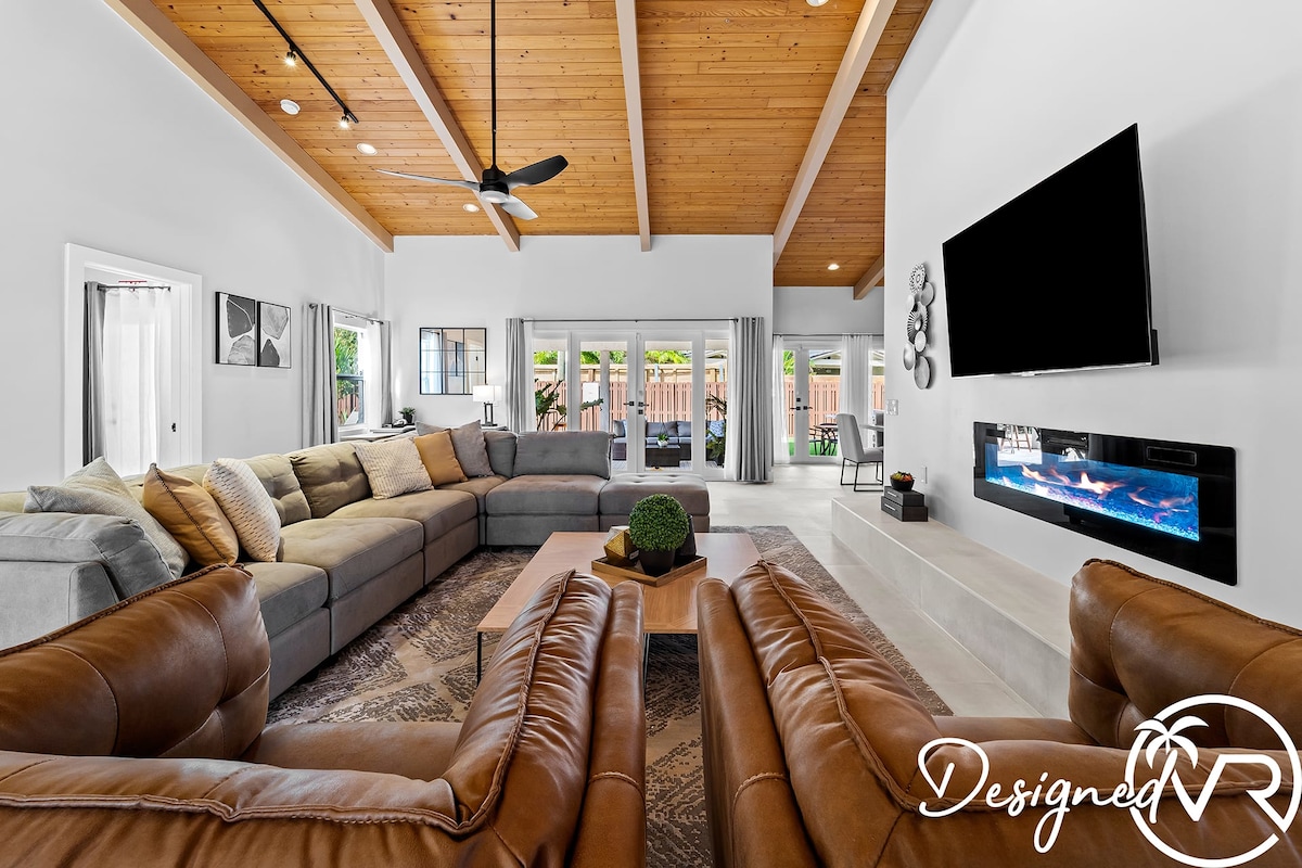 Living room - Tons of natural light, with a large sectional sofa, and a 65" TV, overlooking the pool with access.