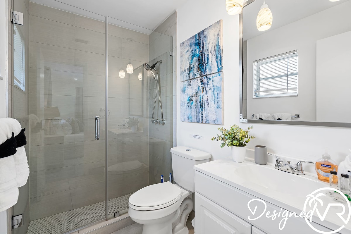 The home features four bedrooms designed for comfort and privacy. The master bedroom includes a king size bed, a large walk-in closet, and direct access to a full private bathroom. A second king size bed sits in bedroom two, while bedroom three offers a queen size bed. Bedroom four includes two queen size beds and direct access to the outdoor pool area. The second full bathroom, with a shower (no tub), is located between bedrooms two and three. All bedrooms include a TV with Roku (no cable), allowing you to sign in to your own streaming accounts.
