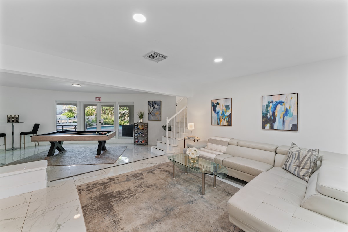 * Living room - 2 living room areas with large sectional sofas additional seating, and a TV. The second living room is by the Kitchen.