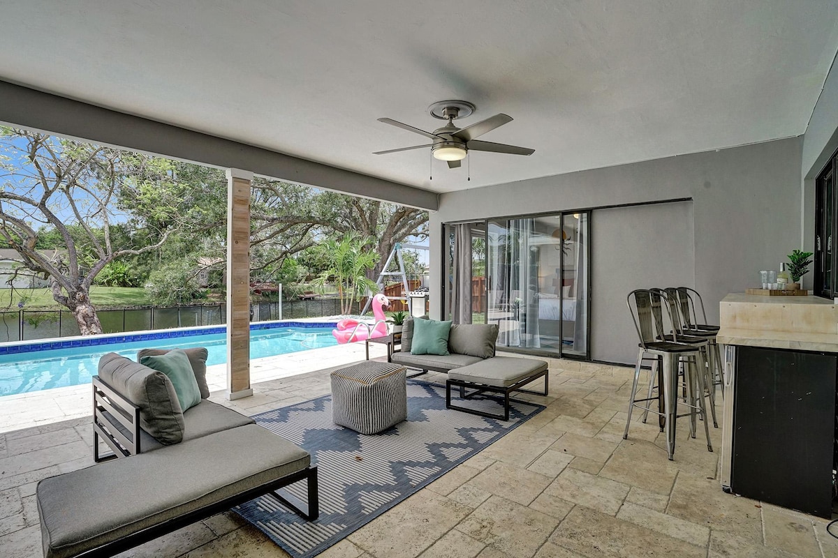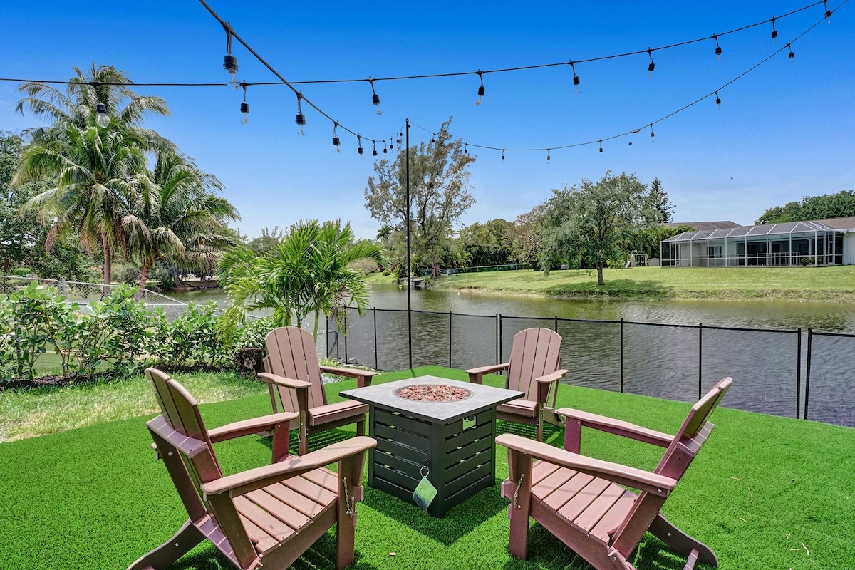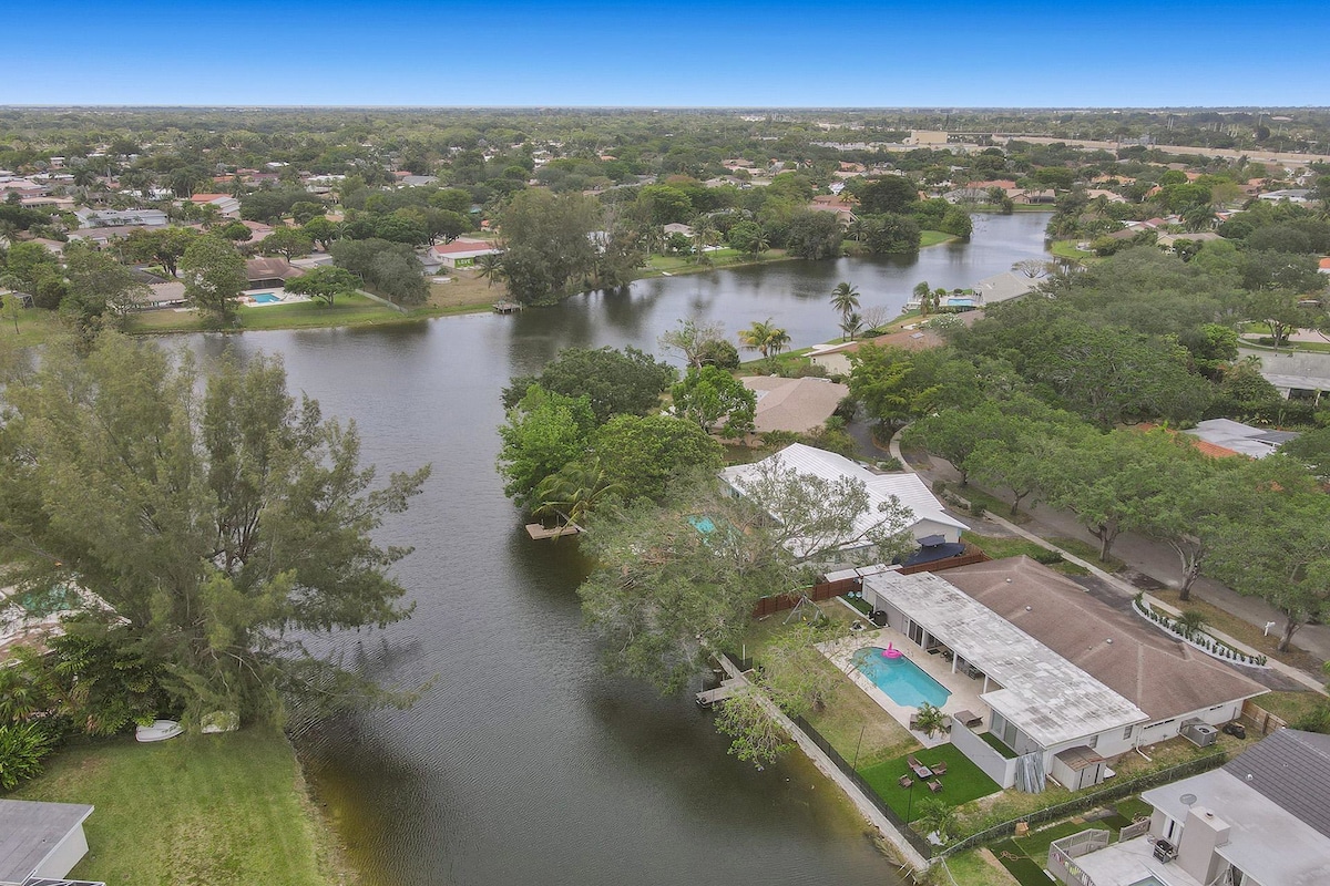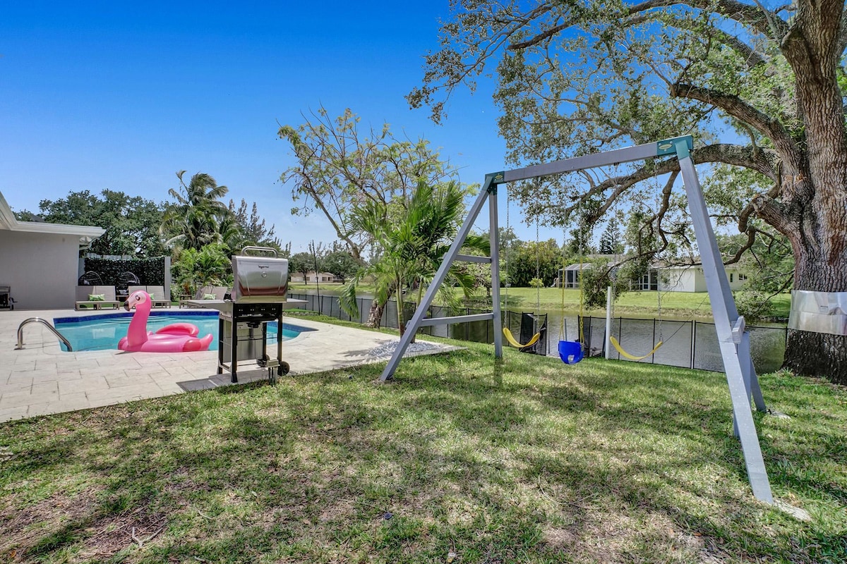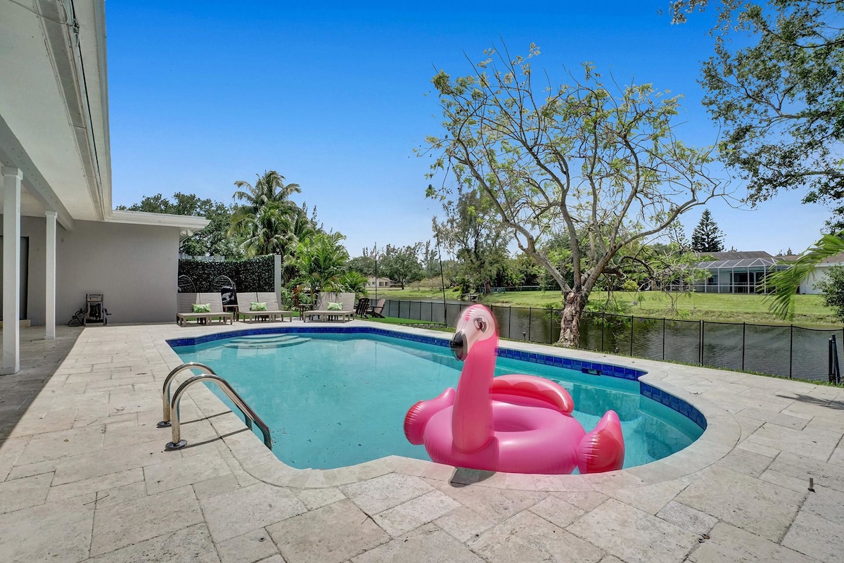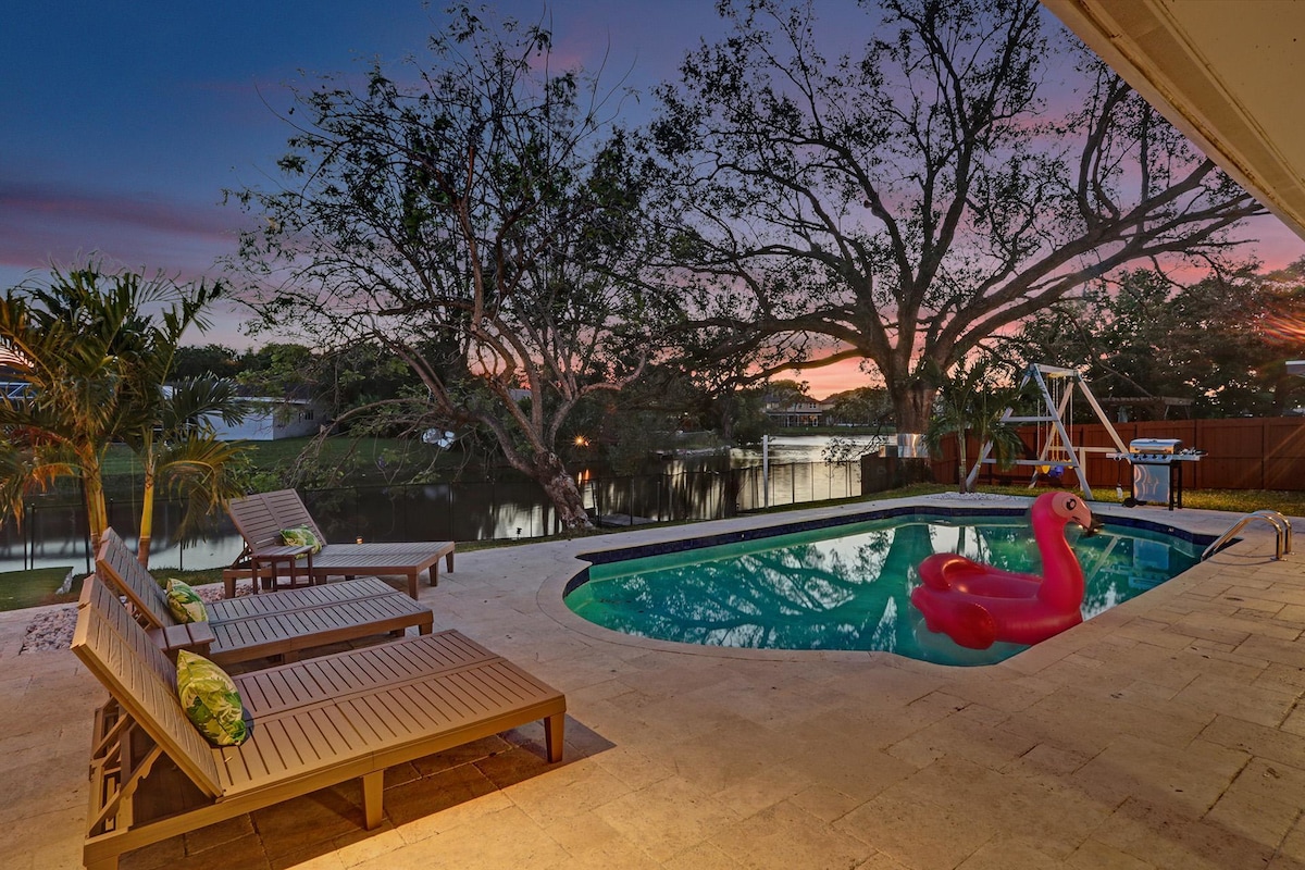 Discover your own private oasis in this stunning 6-bedroom South Florida home, minutes away from Sawgrass Mall. Enjoy breathtaking water views from the backyard, complete with a private pool, water basketball/volleyball, tetherball, fire pit+games. Inside, features a game room for even more fun. With lake access and a prime location, this is the perfect spot for your next vacation with family & friends.