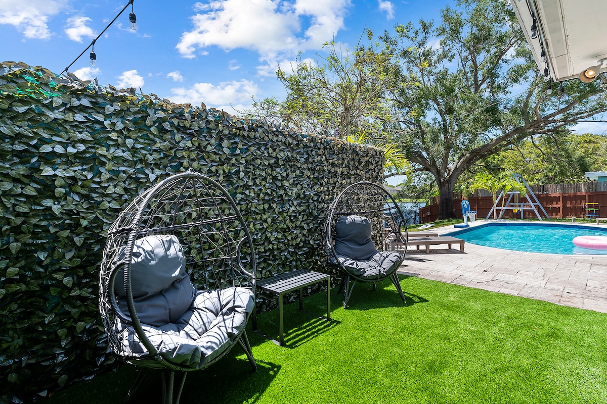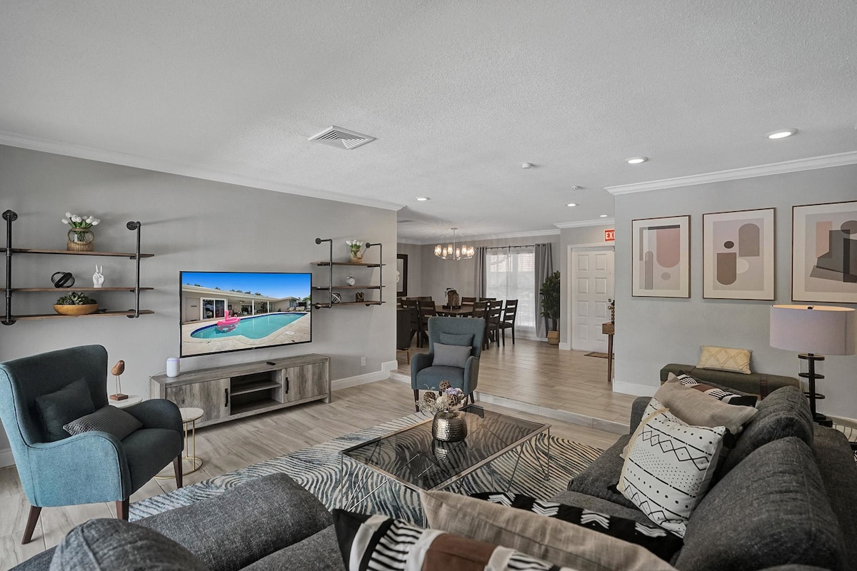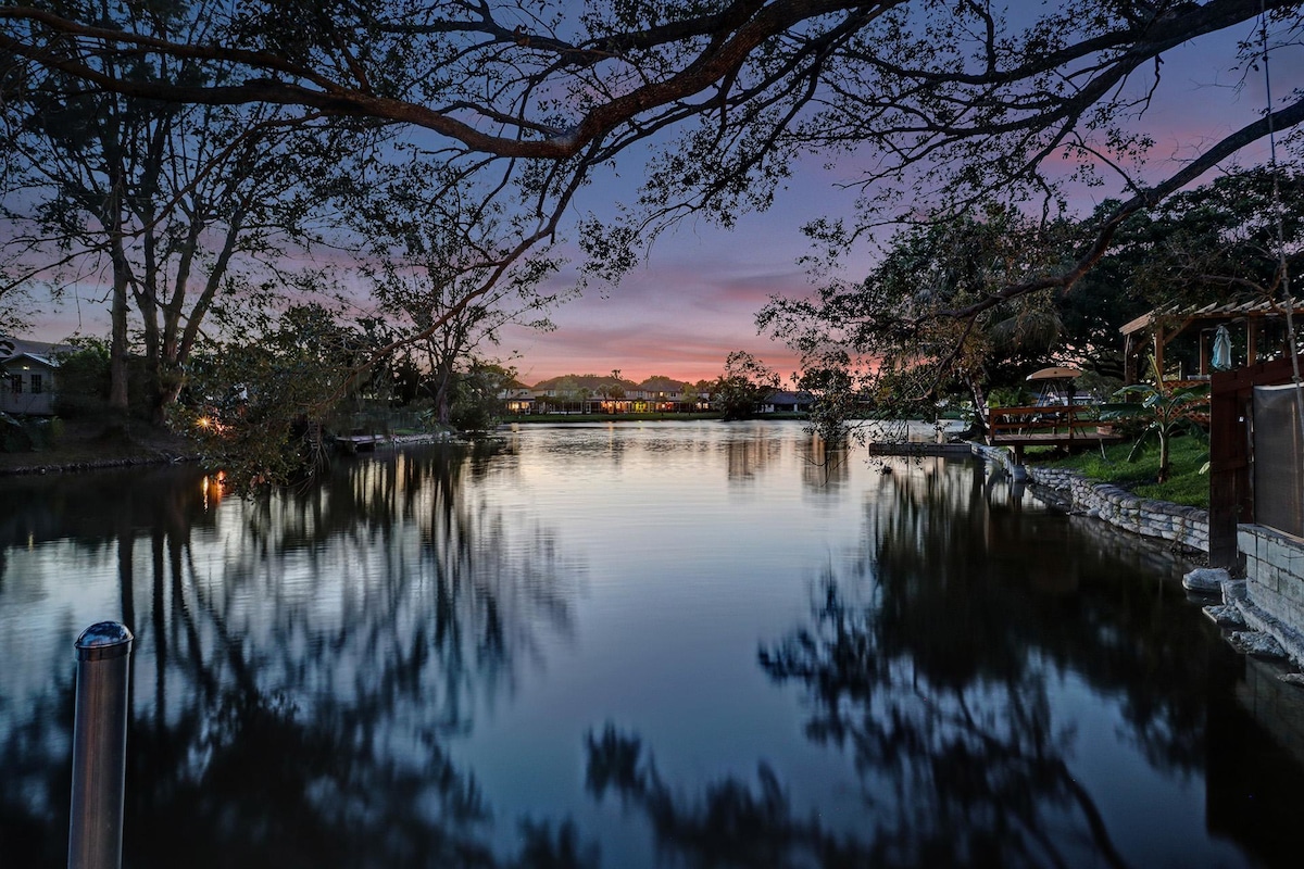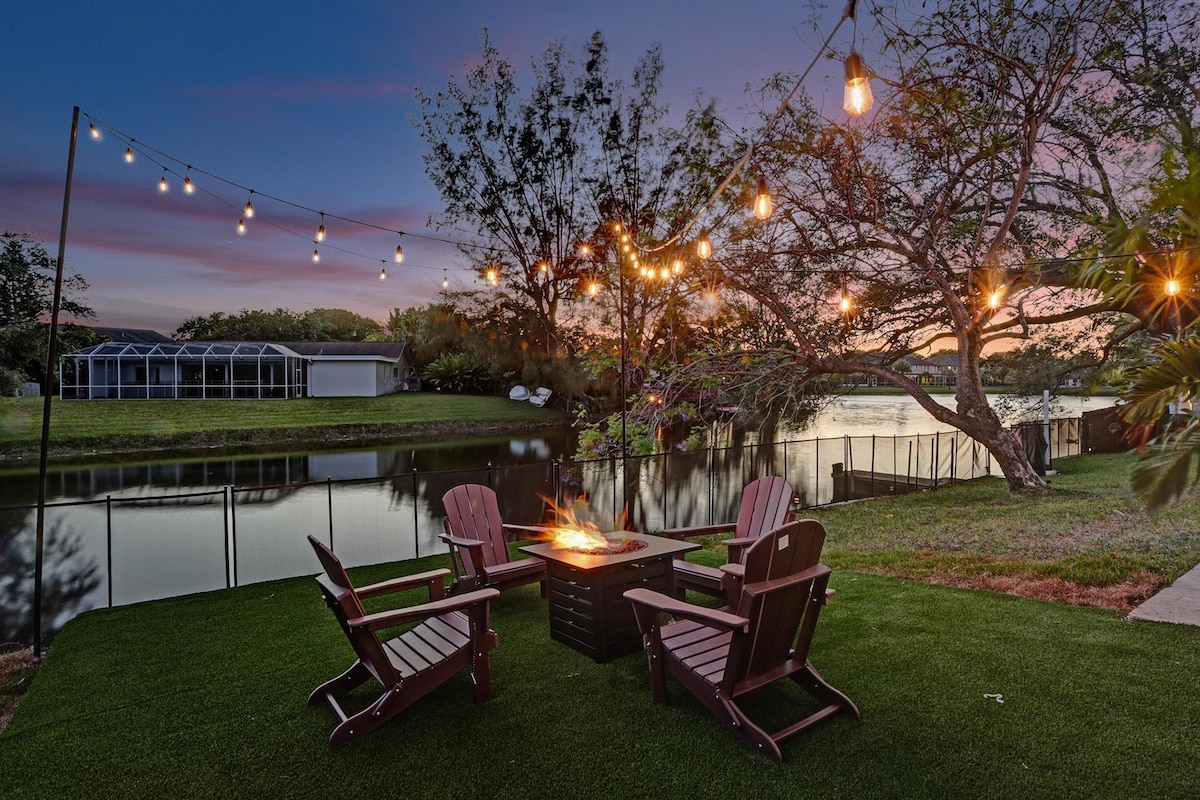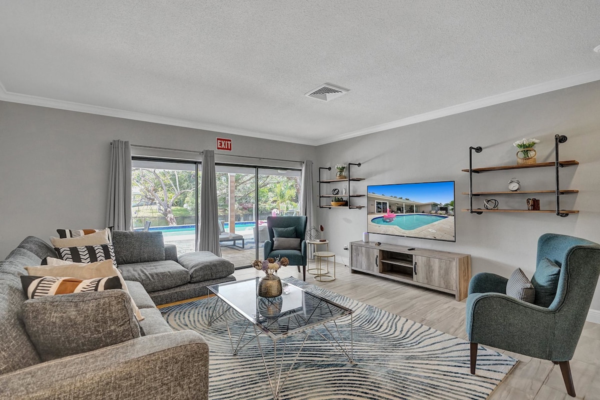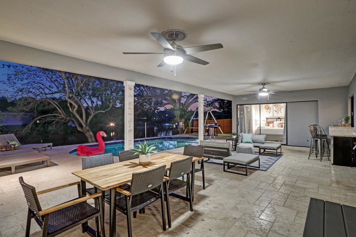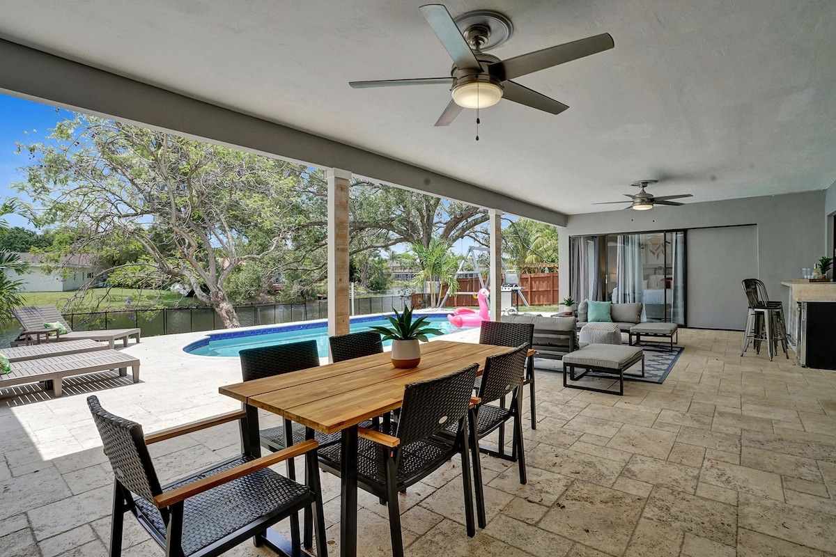 Discover your own private oasis in this stunning 6-bedroom South Florida home, minutes away from Sawgrass Mall. Enjoy breathtaking water views from the backyard, complete with a private pool, water basketball/volleyball, tetherball, fire pit+games. Inside, features a game room for even more fun. With lake access and a prime location, this is the perfect spot for your next vacation with family & friends.