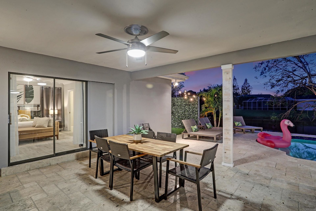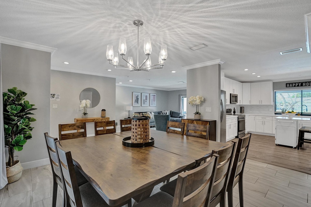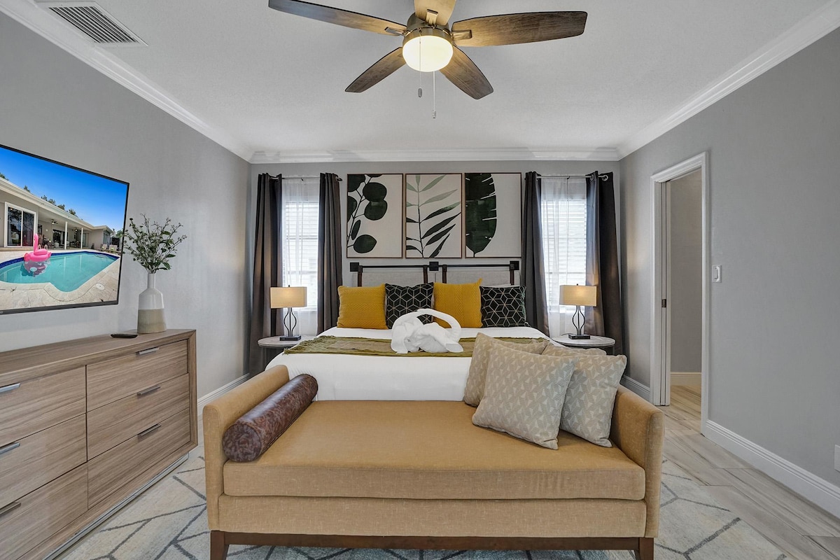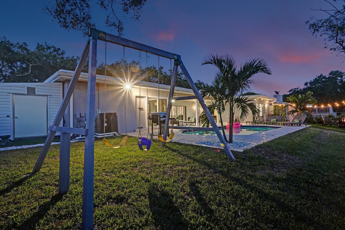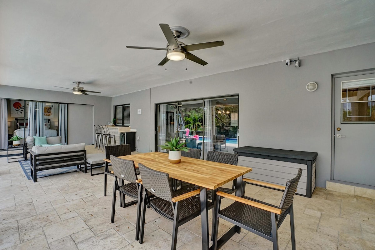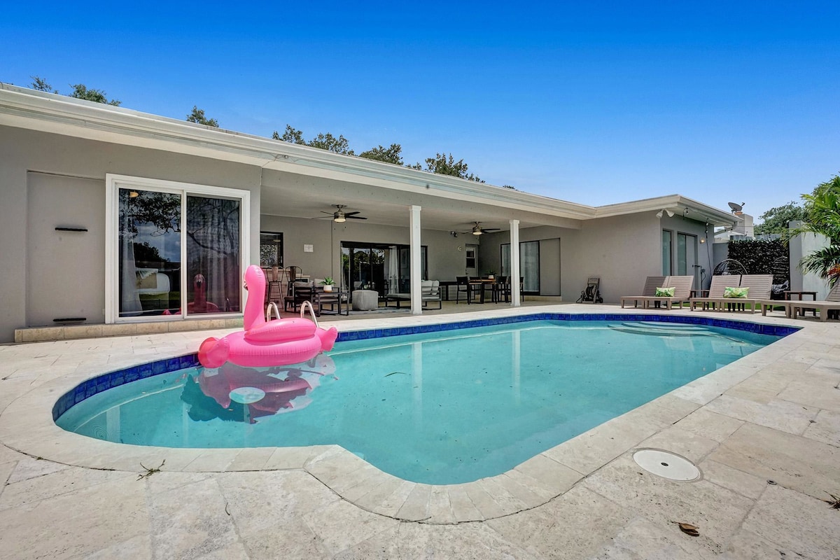 Discover your own private oasis in this stunning 6-bedroom South Florida home, minutes away from Sawgrass Mall. Enjoy breathtaking water views from the backyard, complete with a private pool, water basketball/volleyball, tetherball, fire pit+games. Inside, features a game room for even more fun. With lake access and a prime location, this is the perfect spot for your next vacation with family & friends.