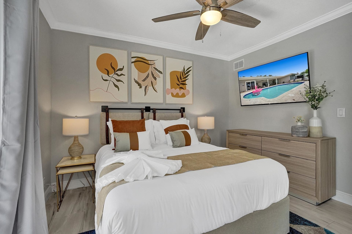 4. Bedroom with a (Master) KING SIZE BED, 50" TV, dresser, hangers, walk-in Closet, access to pool, access to a full private bathroom (shared with the pool and functions as a Cabana bathroom)