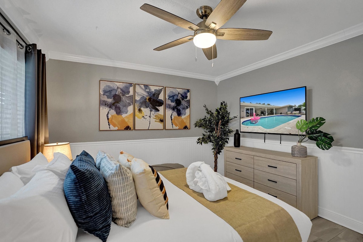5. Bedroom with a QUEEN SIZE BED, 50" TV, dresser, hangers and access to pool.