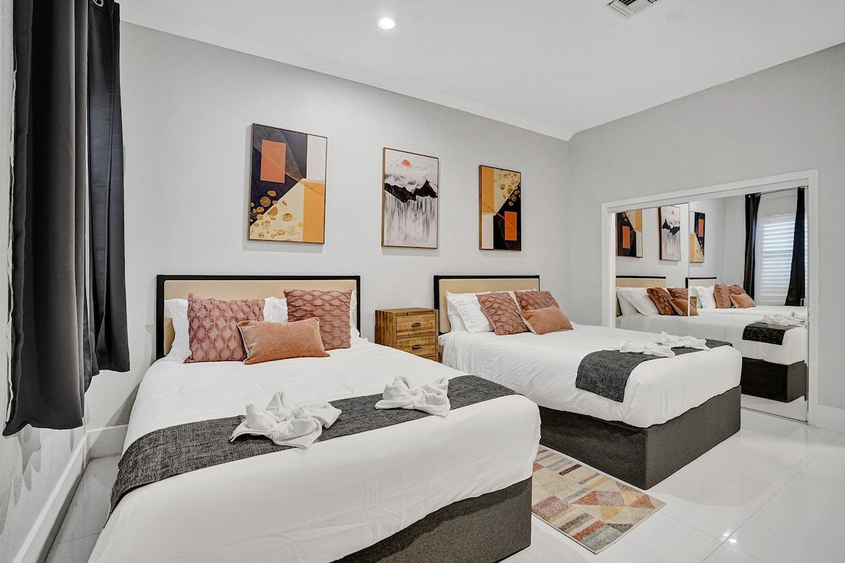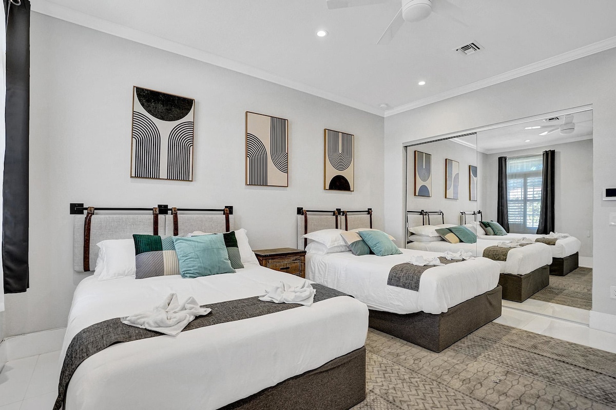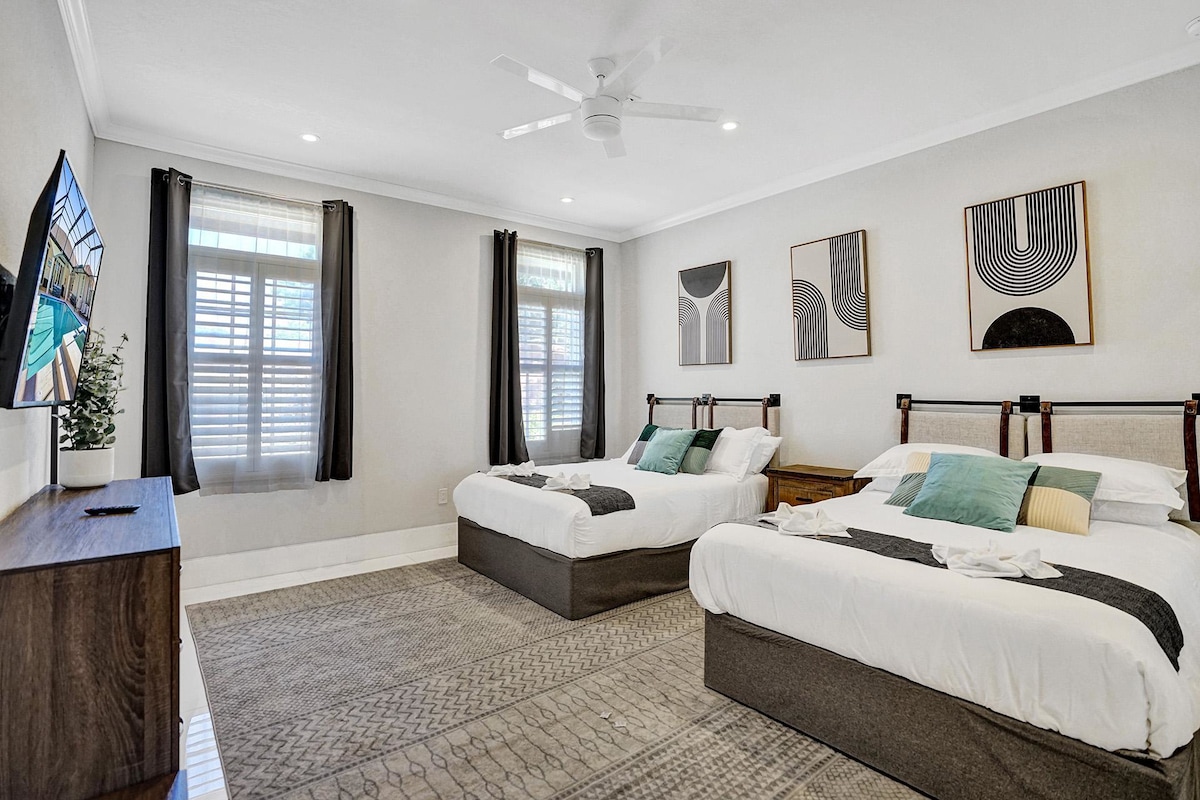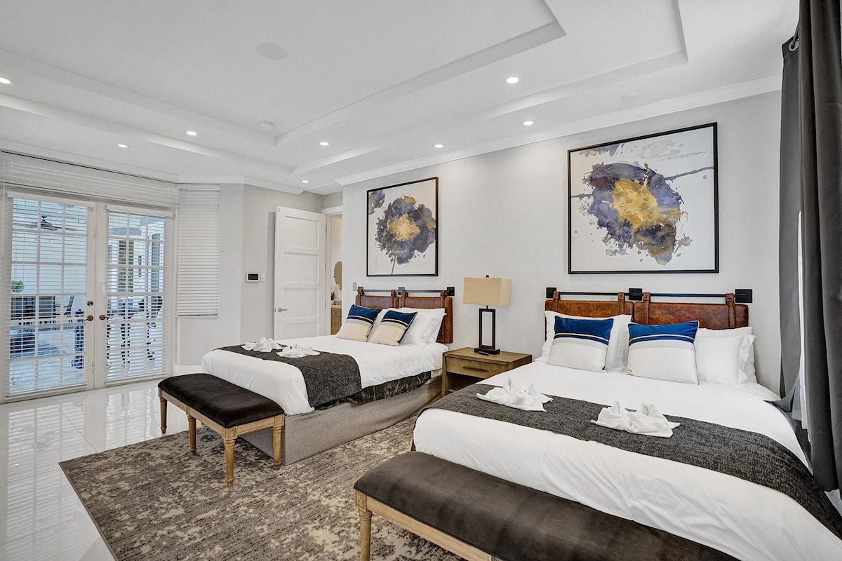 4. Bedroom with (Master) TWO QUEEN SIZE BEDS, access to pool, 65" SmartTV, spacious walk-in closet and access to a full private bathroom.