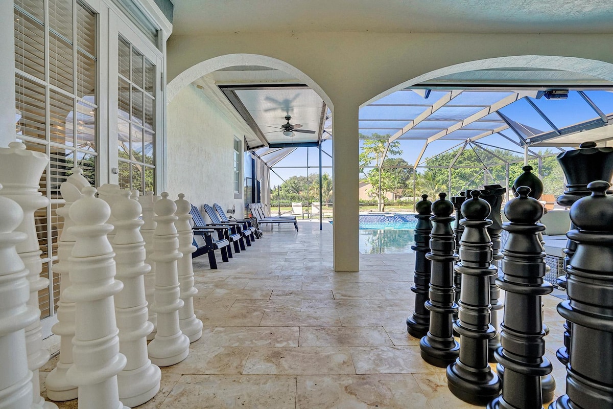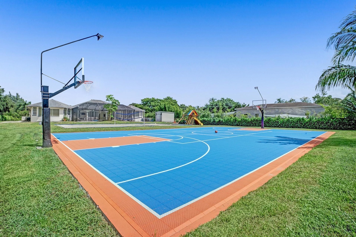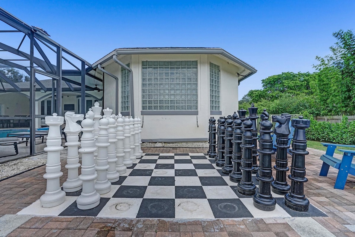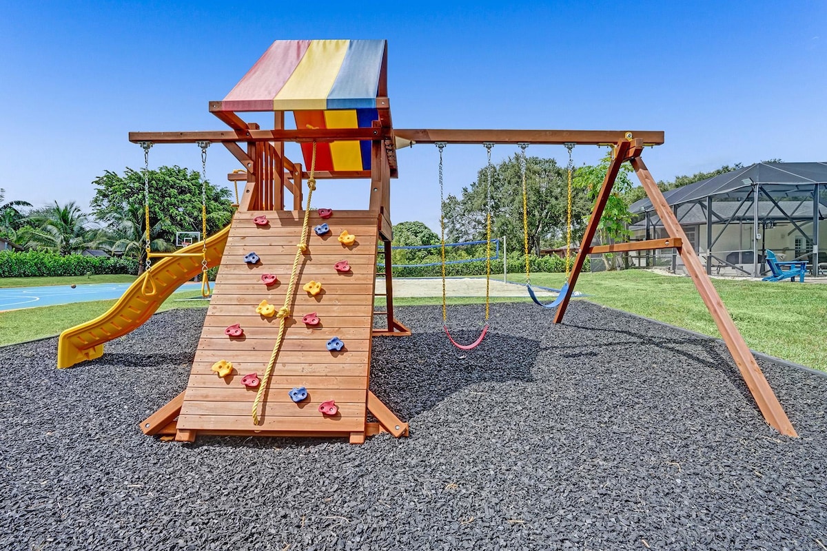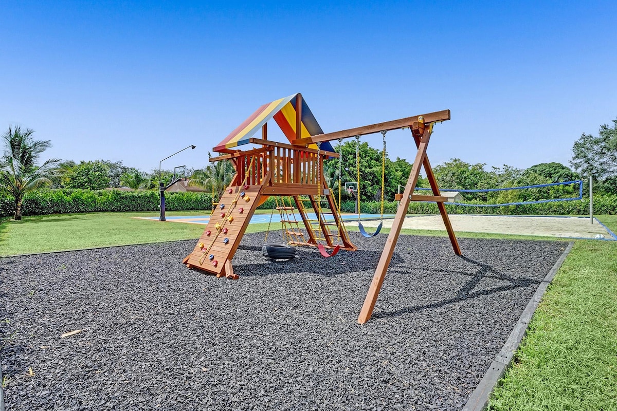 Outdoor - A private heated pool with many sitting areas, including lounge chairs and a dining table for 8 guests with a 55" Smart TV and a fire pit. A large BBQ grill with a stovetop is available for your comfort. Volleyball and basketball courts, Kids playground, and a human-size Chess Game.