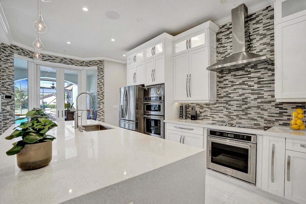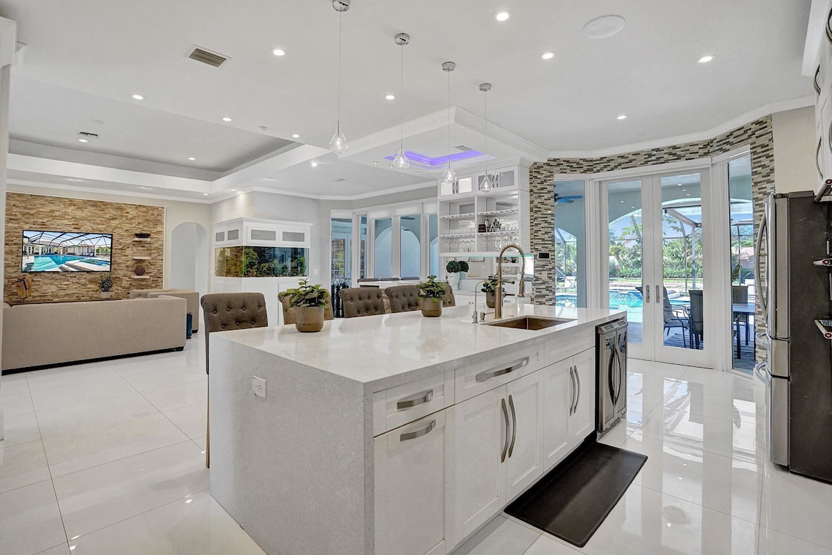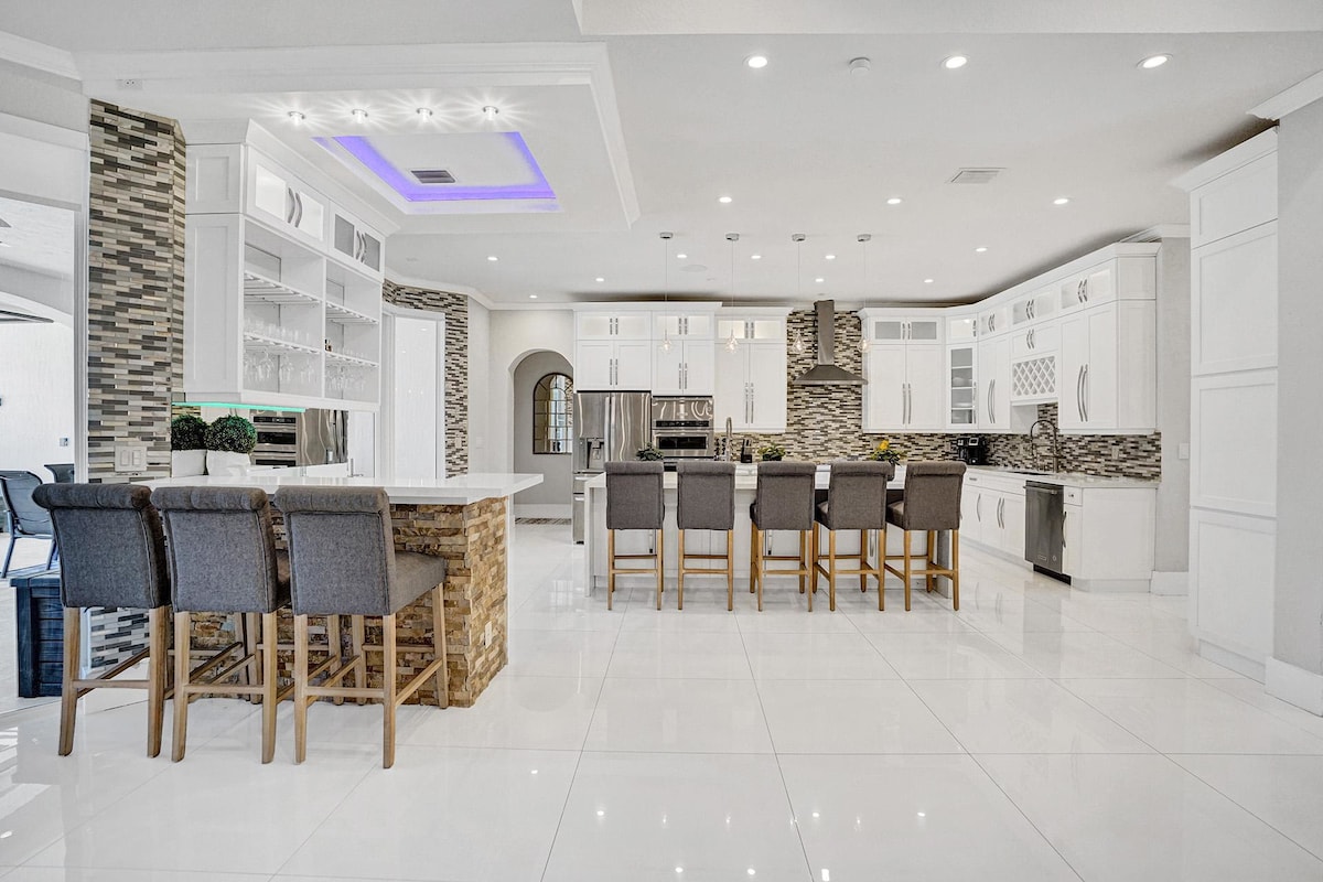 Kitchen - Specious and well stocked, big marble island with a sink, has breakfast nook and a sitting area for 8 guests, Air fryer, coffee maker, wine cooler.