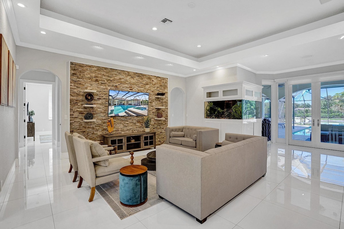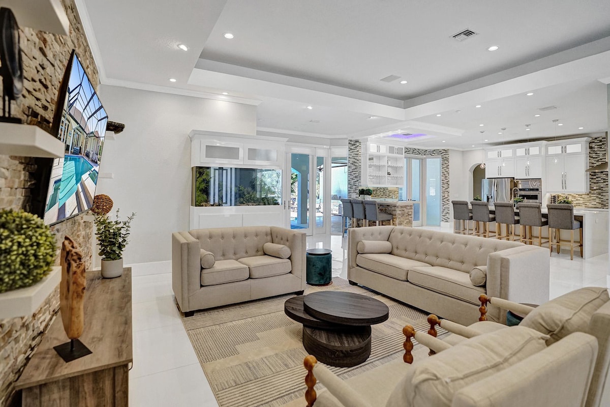 Living Area - Comfortable sitting area with a 65" SmartTV and a pool table.