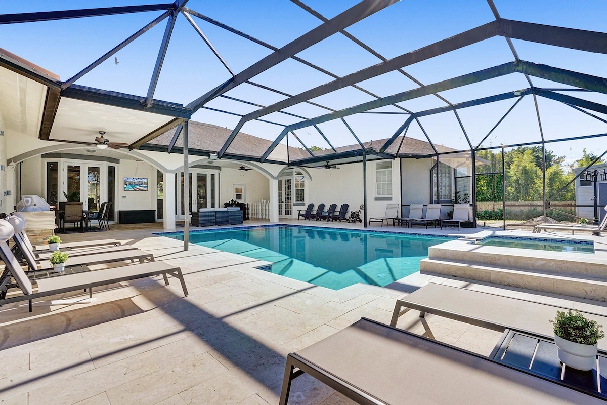 Newly renovated 8 bedroom 6 bath family estate with game room. Enjoy your own outdoor oasis with a private heated pool, sports court, volleyball, BBQ, fire pit, XL chess, chef's kitchen & many sitting areas. Have some fun in the game room, perfect for those traveling w/ kids. Nearby shopping centers & restaurants!