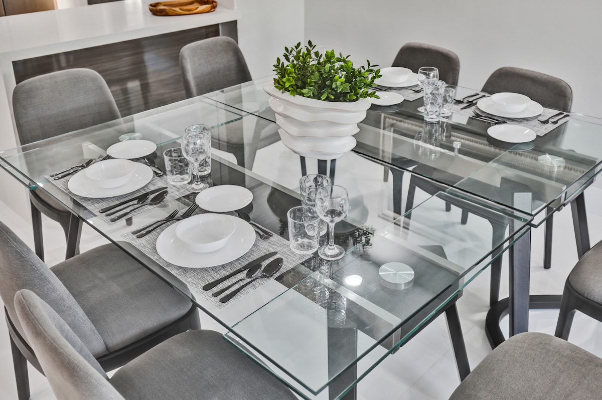 Dining-dining area seats 8 guests at large dining table.