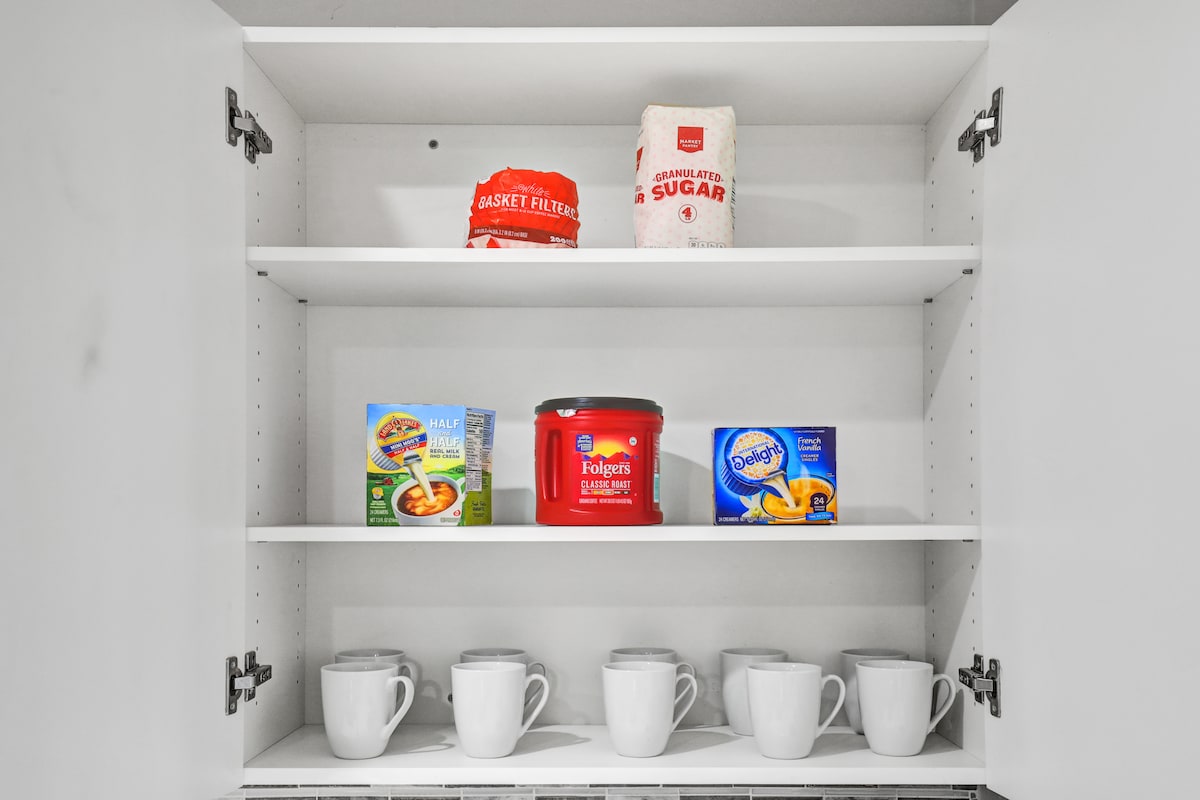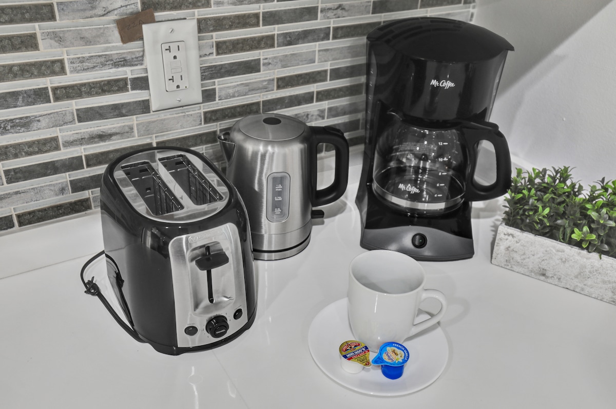 Kitchen-Completely renovated with all new appliances, gorgeous quartz countertops, and ample sleek cabinetry. Fully stocked with all the dishware, cookware, pots and pans you would need to prepare the perfect meal. Also stocked with coffee, creamer and spices.