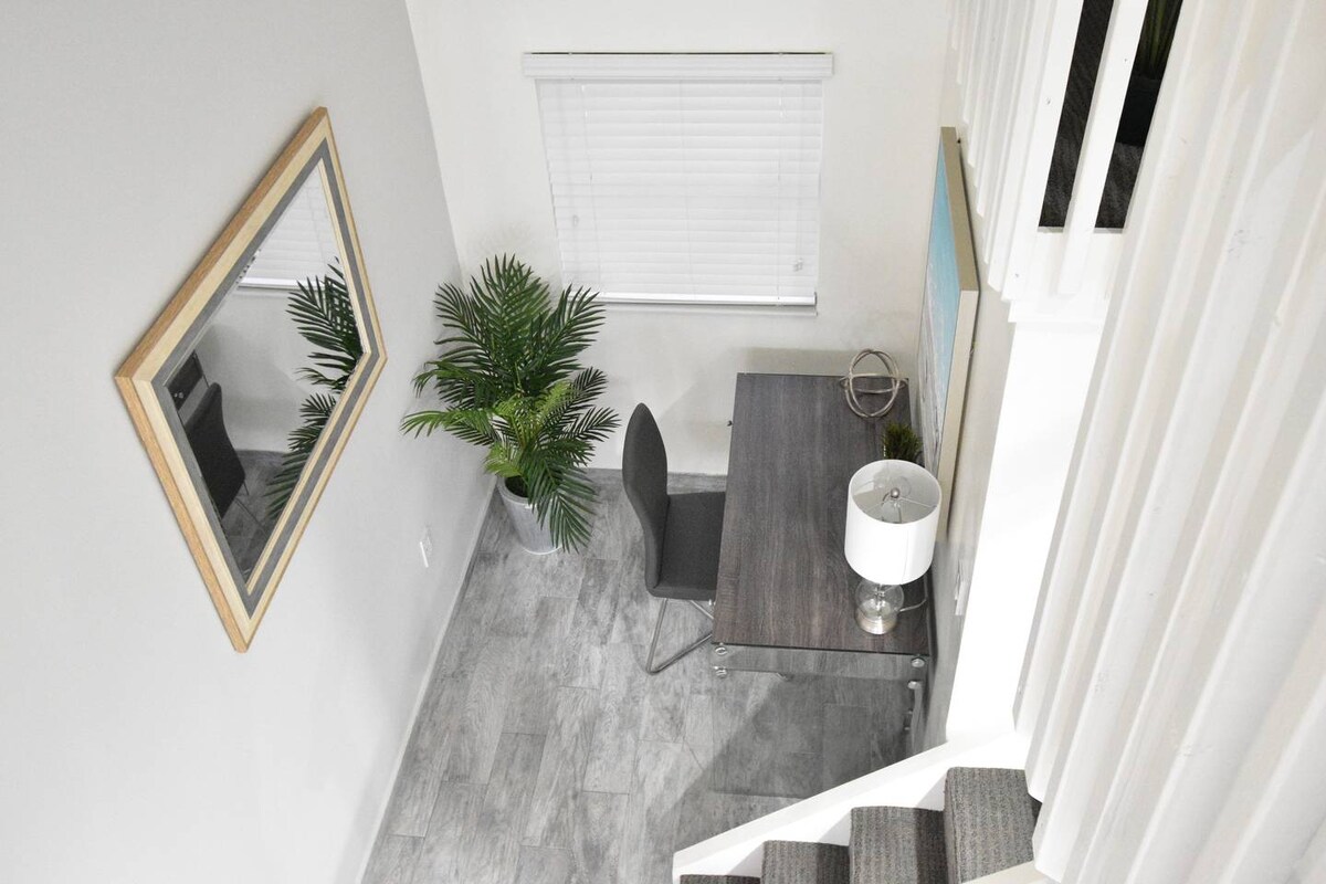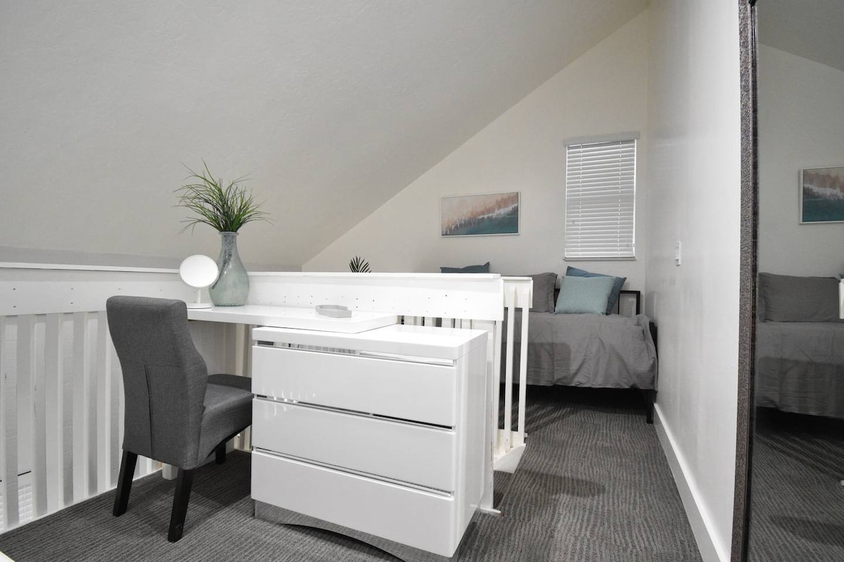 In this apartment, you will find everything you need! We provide a kitchenette, modern accents, a super comfortable queen-size bed and 1 extra single size bed in the loft upstairs. Downstairs we have a sofa, a 40-inch Roku TV and a designated open office space with desk and chair.