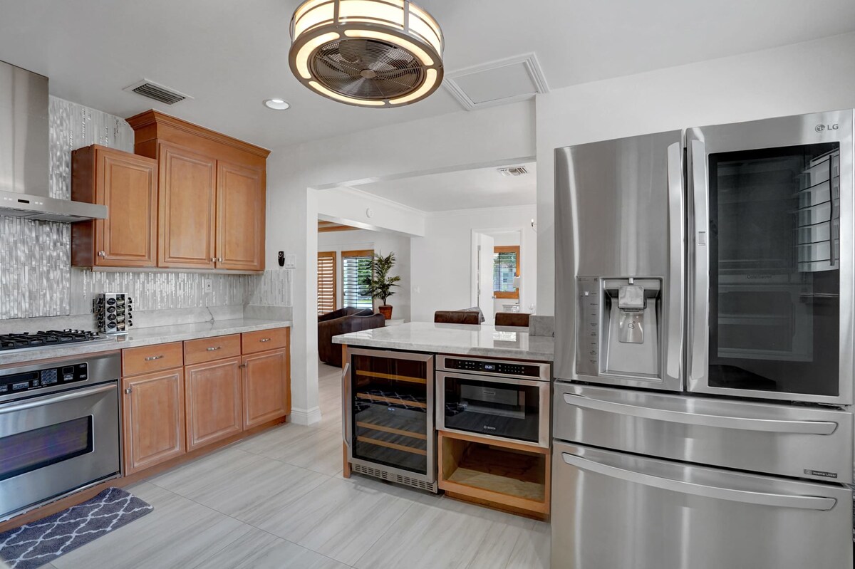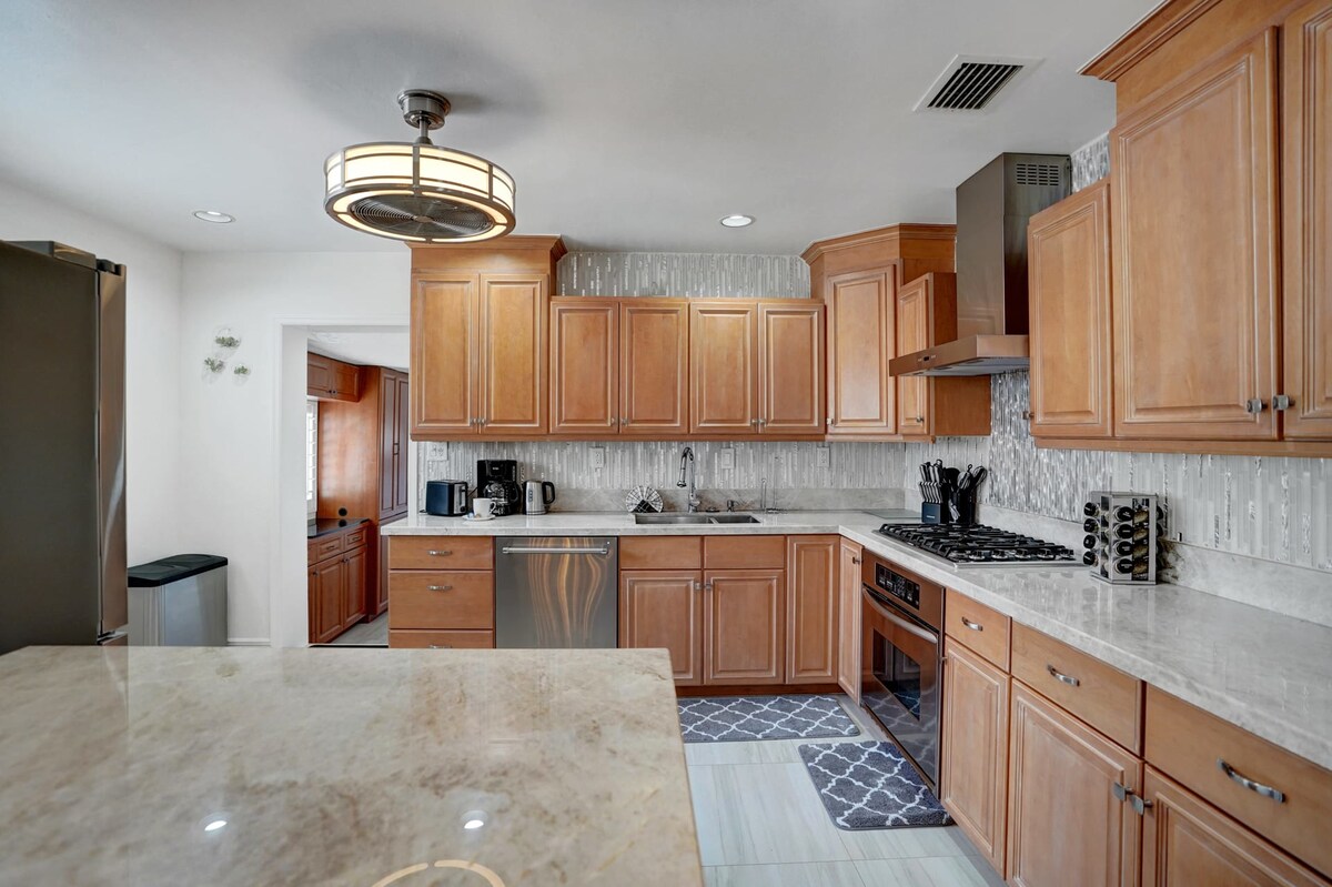 Kitchen-Completely renovated with all new appliances, and ample cabinetry. Fully stocked with all the dishware, cookware, pots, and pans you would need to prepare the perfect meal. Also stocked with coffee, creamer, and spices.